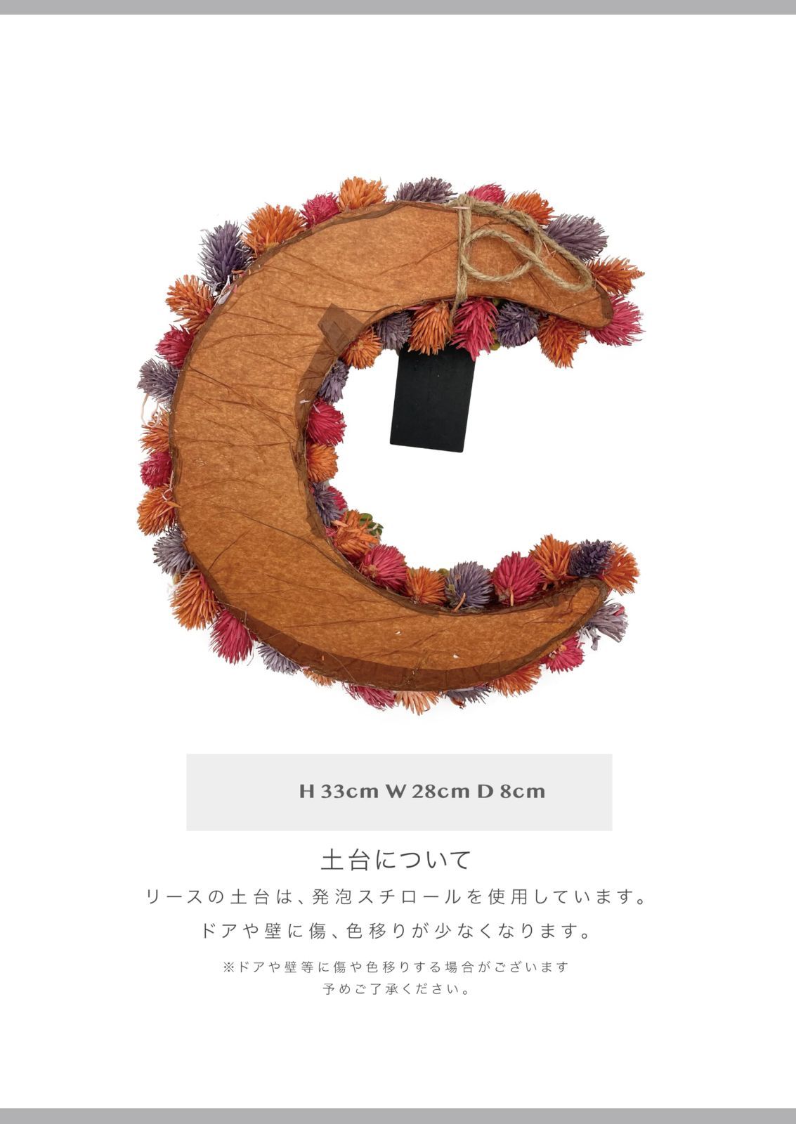 ■ 玄関ドアやお部屋に飾って空間に彩りを加えてみて下さい。 日差しや紫外線に当たると色褪せが起こる場合がございます。 湿気や湿度によってカビなどが付着する場合がございます。 雨や水などに濡れてしまうとパーツが取れてしまう原因になるので避けてご使用下さい。