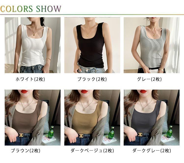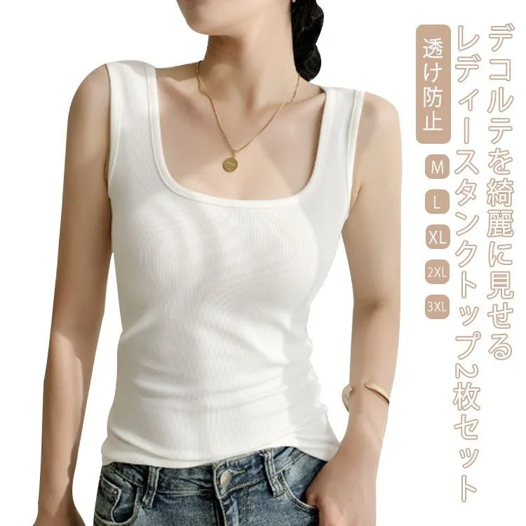 ■沖縄・離島は配送料が異なります。ご購入前にコメントをお願いいたします。 商品説明 デコルテを綺麗に見せるレディースタンクトップ2枚セット。 期待のリブ素材、春夏も引き続き大注目トレンドを起こすためのマストアイテム。 特徴 * 広めの幅でブラ紐をしっかり隠すデザイン。 * 伸縮性に優れた薄手の生地を採用しているため、どんなトップスの下でも着ぶくれ感ゼロ。 * 脇下もしっかりフィットし、どんな姿勢でもしっかりカバー。 * トレンドのシアーブラウスもこれなら安心して着用できます。 サイズ詳細 * M バスト(68cm) 着丈(49cm) 肩幅(30cm) 体重参考(42.5-50kg) * L バスト(72cm) 着丈(50cm) 肩幅(31cm) 体重参考(50-57.5kg) * XL バスト(76cm) 着丈(51cm) 肩幅(32cm) 体重参考(57.5-65kg) * 2XL バスト(78cm) 着丈(52cm) 肩幅(33cm) 体重参考(65-72.5kg) * 3XL バスト(80cm) 着丈(53cm) 肩幅(34cm) 体重参考(72.5-80kg) ※素人採寸ですので、1-3cm程度の誤差がある場合がございます。 素材 ポリウレタン カラー ブラック、ホワイト、グレー、ダークベージュ、ブラウン、ダークグレー (各色2枚セット)