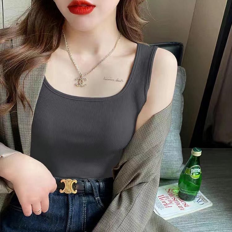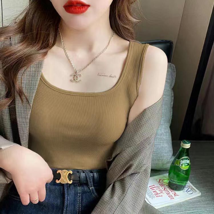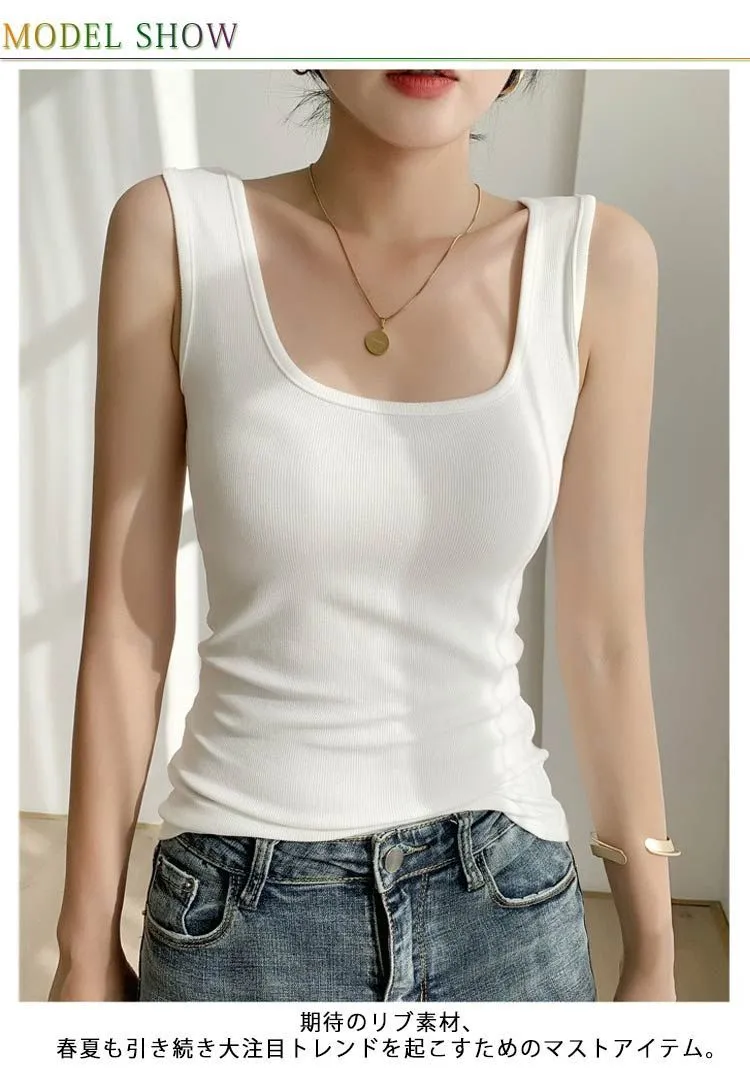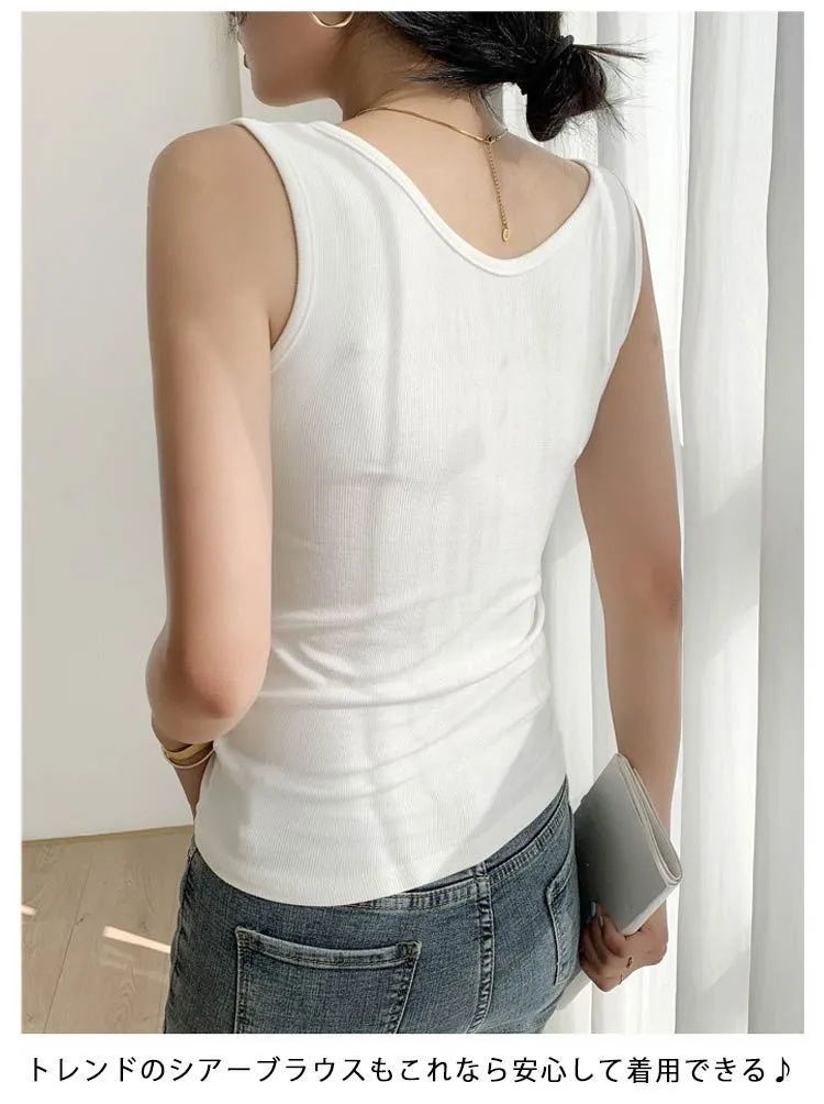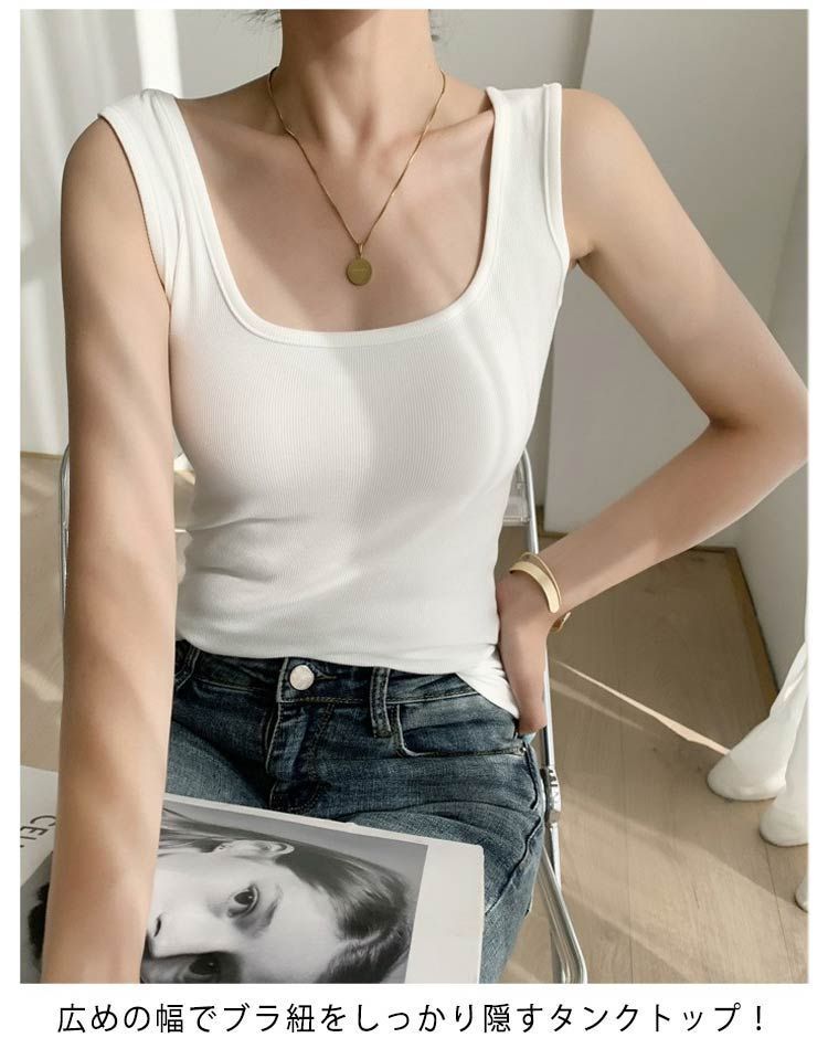 トップス カットソー ブラ紐隠し インナー タンクトップ レディース ノースリーブ キャミソール リブ 透け防止 スクエアネック 無地 2枚セット 大人 美デコルテ オシャレ