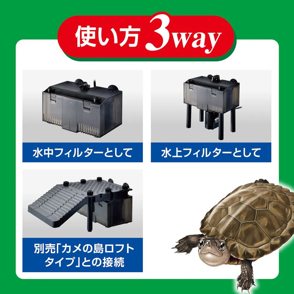 【使い方3WAY】:水中フィルター、水上フィルター、別売りの「カメの島ロフトタイプ」との接続など、3通りの使い方!