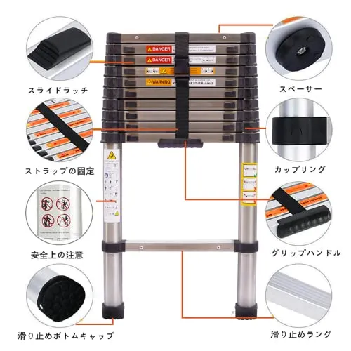 【頑丈で安定&操作簡単】はしごは150kgの運搬能力を持つ高硬度ステンレス鋼製です。アルミニウムの材質は軟らかいため、荷重が強いにもかかわらず、アルミ製のはしごを使用すると、避けられないわずかな屈曲現象が現れ、恐怖を感じやすい。ステンレスはしごはそれを克服しました、鋼のはしごの材質はやや硬くて、アルミニウムのはしごと同じ体積の状況の下で、全体の強度と荷重の能力はすべて更に強くて、しかも基本的に曲がって現象が現れないで、目に見える安全で、人に更に安心させます。つま先キャップは、凹凸構造、テーパーデザイン、滑り止め設計を採用し、各ペダルも滑り止めボードを採用し、安定性を確保しています。各ステップには個別のロックが装備されています。 ステップを簡単に調整して、任意