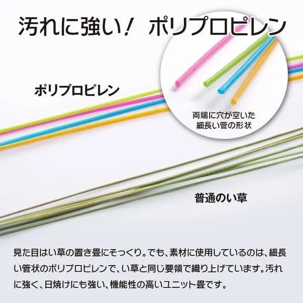 ■商品内容 届いたユニット畳を床に置くだけで和のスペースが出来上がります。表地にはポリプロピレンを細いパイプ状にして織込んだ生地を使用しています。強度が高くしっかりとしていて、汚れても表面を水拭きできるので、いつでも清潔にご使用頂けます。お子様の部屋に、ペットのいるご家庭に最適な商品です。中材には弾力性にこだわり15mm厚の硬わたを使用しました。硬綿には青森ヒバ加工を施しています。青森ヒバに含まれるヒノキチオールは天然の物質としてきわめて抗菌力が強い成分です(抗菌、防臭効果)。また軽量タイプなので、持ち運び、設置、片づけなども楽にできます。連結用ジョイントを使用すれば、お部屋に合わせて簡単に何枚でもつなげることが出来ます。