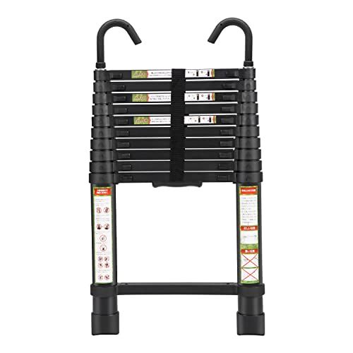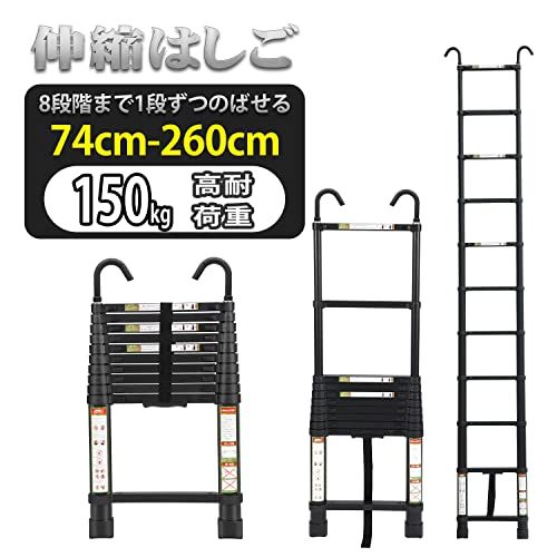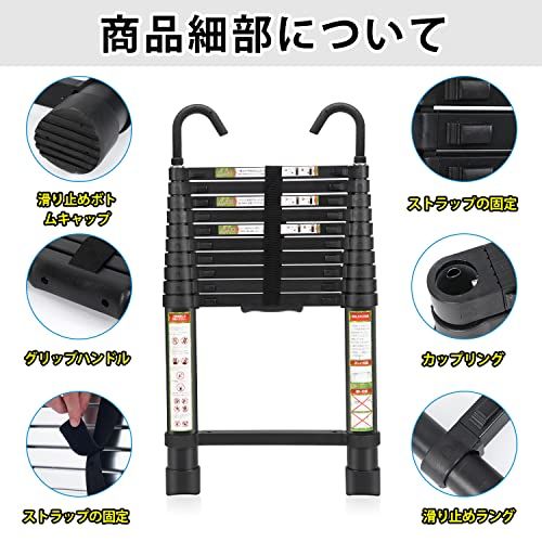 RIKADE 伸縮はしご 耐荷重150kg 軽量 持ち運びやすい 折り畳み 伸縮梯子 多機能アルミはしご 自動ロック スライド式 伸縮自在 梯子 室内室外両用 スライド式 フック付き (ブラック, 2.6m):