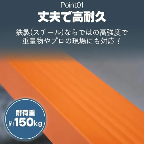 【頑丈な作り】スチール製ならではの頑丈な作りで重量物やプロの現場にも対応!耐荷重は約150kg、重い物を持ちながら、はしごに乗っても大丈夫。耐久構造で現場や屋外作業に最適。