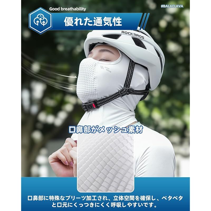 【吸汗速乾・ストレッチ性】速乾性に優れた夏用バラクラバは、汗による不快感を軽減し、サラサラ爽やかな着用感を維持します。吸われた汗が蒸発する時の気化熱で汗をかけばかくほど逆に快適です。伸縮性がとても高いので、口元部分を下にずらすことも可能です。リフレッシュしたい時や給水補給したい時にも使い勝手がよいです。反射ロゴ付き、夜間のライドでも視認性を高め、安全性を向上します。