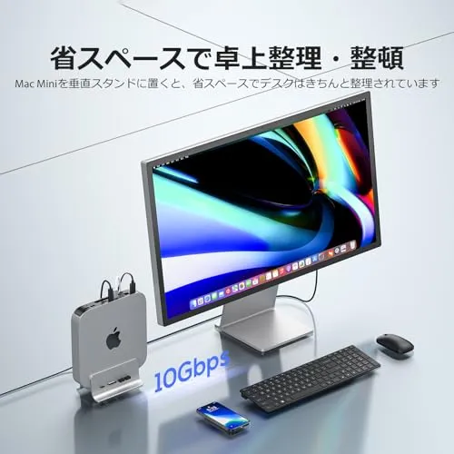 5 in 1 USB C ハブ Mac Mini用 スタンド 縦置き ドッキングステーション アルミ合金 2×USBC 3.2 gen 2 10Gbps, 1×MicroSD/TF カードリーダー, Mac Mini 拡張 NVMe/SATA SSDスロット付