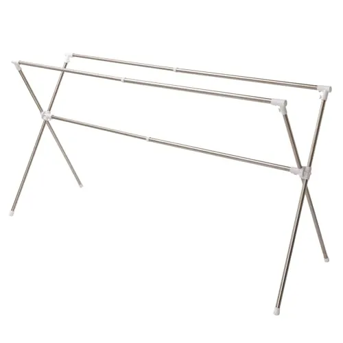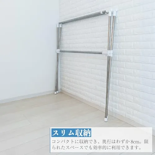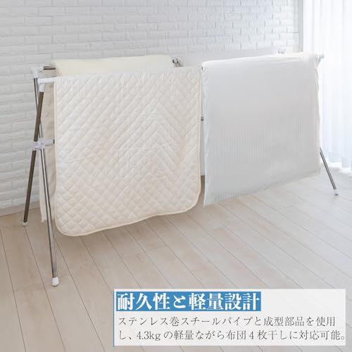 ふとん4枚迄干せるクロス型ふとんほし。奥行の狭い場所でも使えます。横幅は伸縮式なので大きく使えて収納はコンパクトになります。組み立ては工具不要。かけられる枚数: ふとん4枚迄。耐荷重: 全体で20kg迄。(材質)パイプ:ステンレスパイプ、ステンレス巻きスチ-ルパイプ、成型部品:ABS樹脂、PP樹脂、ネジ類:スチ-ル(メッキ)。