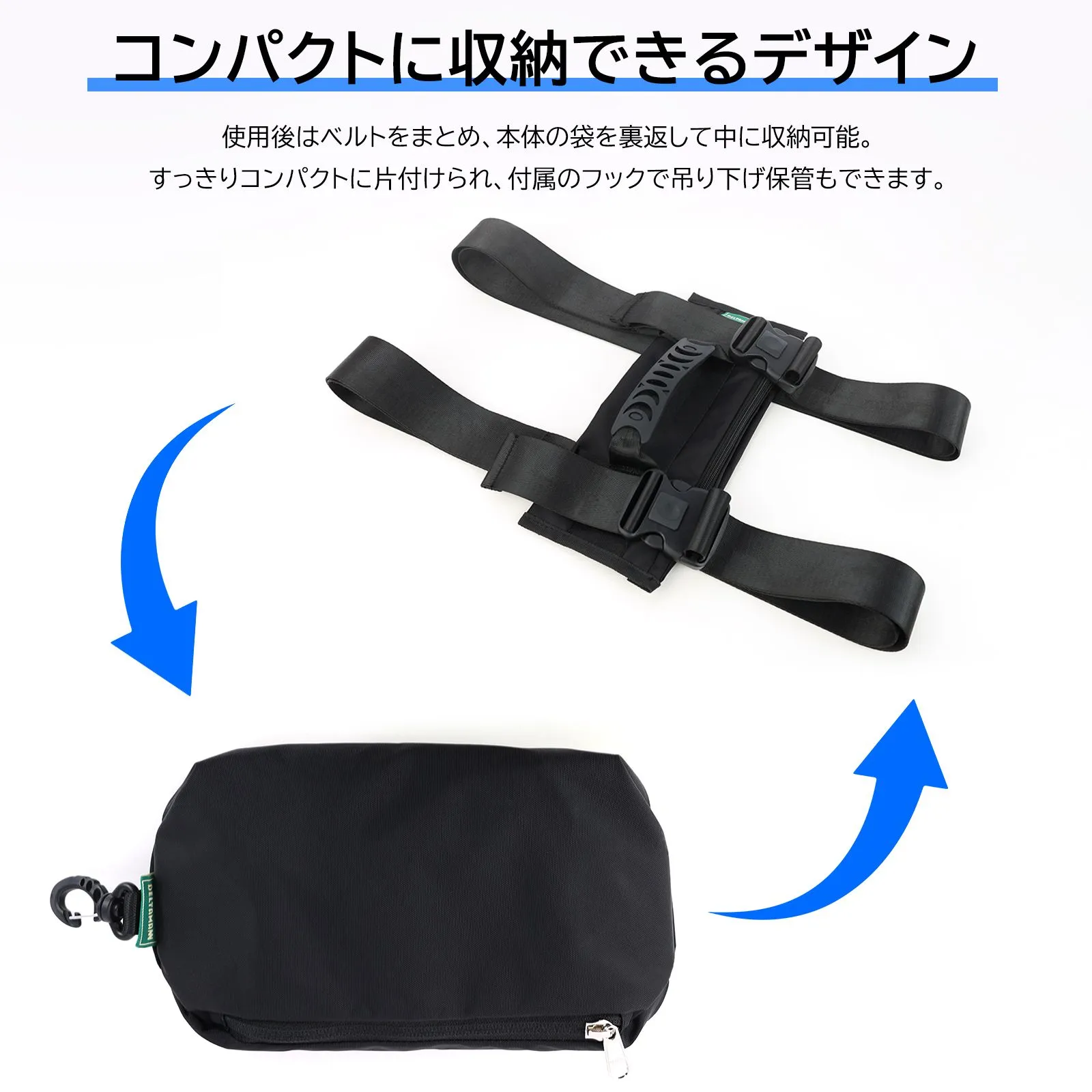 【すっきり収納できるコンパクト設計】 使用後はベルトを本体袋にまとめ、袋を裏返してコンパクトに収納可能。かさばらず、持ち運びもスマートです。