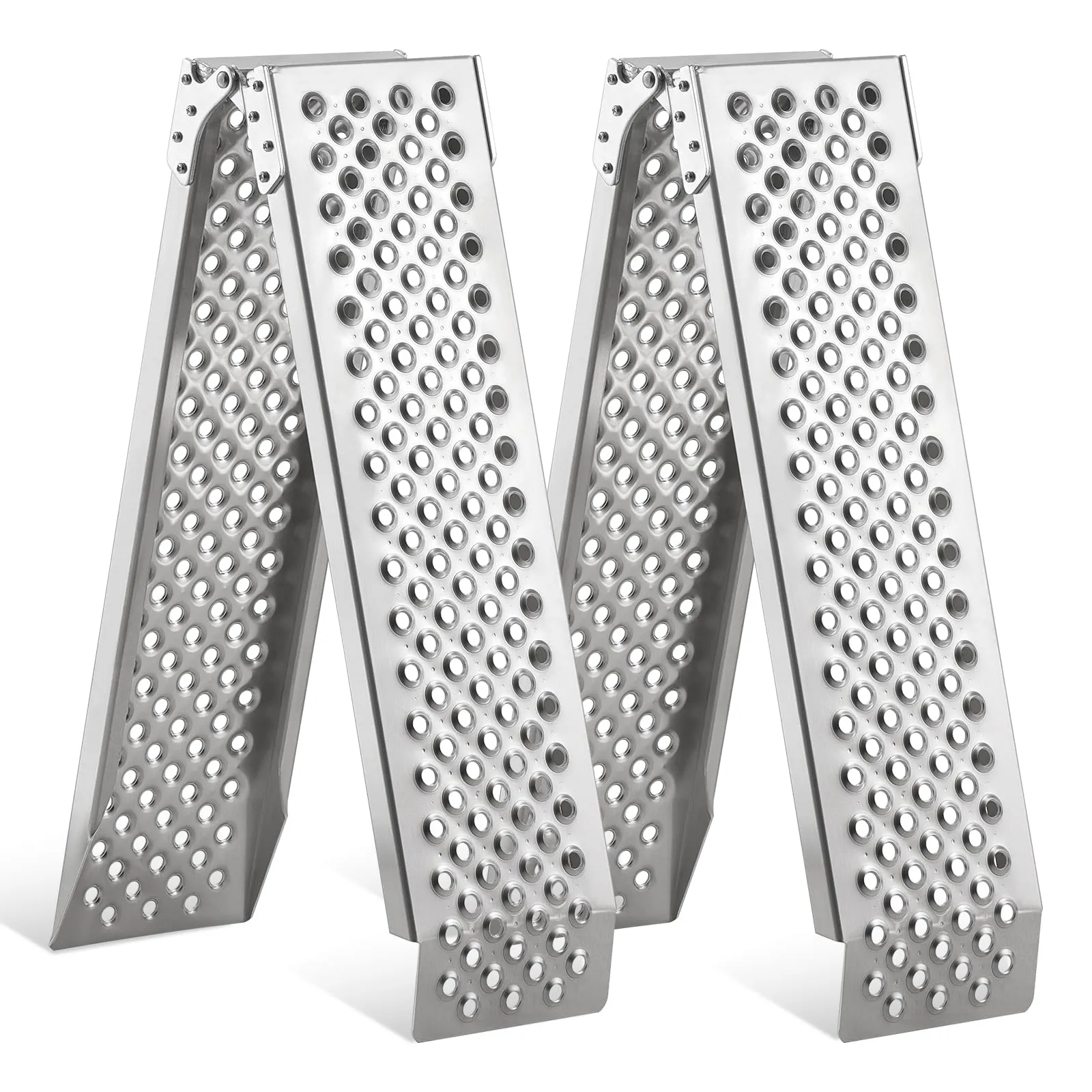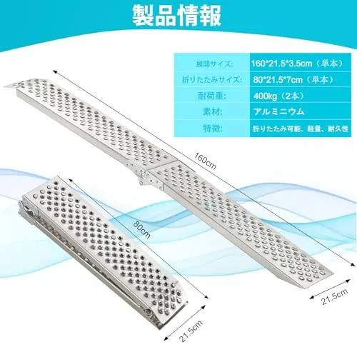 【商品仕様】アルミブリッジ折りたたみ式のサイズ:長さ160*幅21.5*高さ3.5cm(単本)、製品の重さ:約6.3kg(2本)、耐荷重:680kg(2本)、使用高さ範囲:50cm以下、タイヤの幅が21cm以内の車両に適しています。