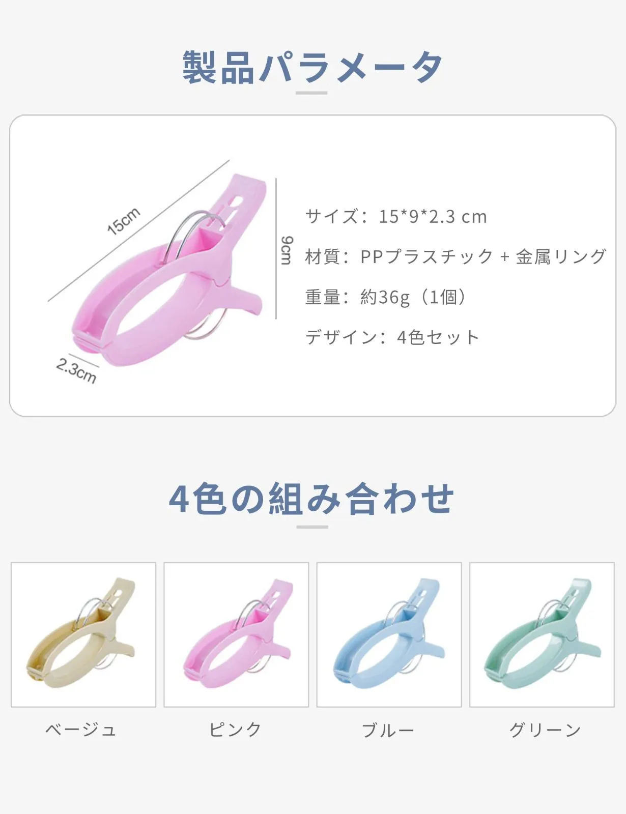 ■こちらの商品は沖縄・離島は配送料が異なります。 ご購入前にお知らせください。 お住まいの地域に合わせた専用ページを作成いたします。 ご覧いただきありがとうございます. 洗濯ばさみ 大 洗濯バサミ 4個入り 布団 レック 強力 ダブルバネ 特大サイズ布団ばさみ 手すり ピンチ 竿用ピンチ 洗濯クリップ 洗濯物干し竿用 部屋干し ベランダ 室外干し 防風タイプ 滑り止め 洗濯ピンチ 固定 竿ピンチ タオル干し竿受け [実用的なデザイン]軽量で丈夫なポータブルタオルのクリップ.衣類などの洗濯物、夏用のタオルケットから冬用布団まで、幅広くご利用頂けます. [大きいサイズ]製品のサイズは約15*9*2.3cmです.普通のクリップよりもサイズが大きいので、より重い布団や服を挟むことができます.頑丈なあごとバネで強いグリップ力を確保し、風が吹いている日にタオルや衣服が吹き飛ばされるのを防ぐことができます. [製品資料]プラスチックPP素材製、環境に優しく、耐久性があります、衣服を傷つけません、優れたクランプ力、手に快適で、それを引っ張るのに多くの労力を要しません、クリップにはダブルメタルスプリングが入っていて弾力性がよく大きな開口を引っ張ることができます. [家庭や旅行]日常的な使用、家庭や旅行に最適です. どこにでも保存して持ち運ぶことができる軽量で堅牢な構造.タオルを日光浴ベッド、太陽椅子、プール椅子に挟むのに最適です. 布団、シーツ、カーテン、服を挟むために使われます. [製品が含まれます]パッケージには大きなクリップが4つ含まれており、それぞれ鮮やかな4色. 明るいカラータオルのクリップは、紛失していないかどうかを簡単に見つけることができます. 最後までご確認頂き誠にありがとうございました. 上記をご確認頂き、ご購入いただけましたら幸いです. 何かご不明な点がございましたらお気軽にメッセージからお問い合わせ下さい. プラス配送料の目安 沖縄・離島 +2,000円