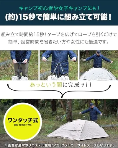 【約15秒で簡単に組み立て】組み立ての所要時間は(約)15秒!タープを広げてロープを引くだけなので女性でも簡単!設営時間を省きたい方にもピッタリ