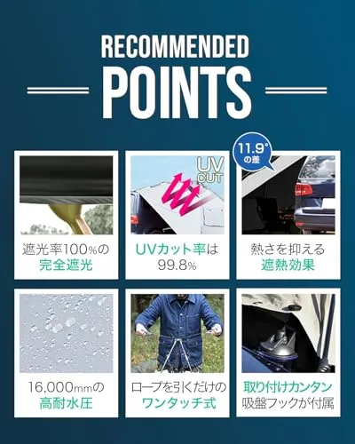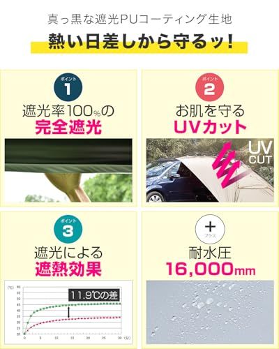 【真っ黒な遮光PUコーティング生地で熱い日差しから守る!】1.遮光率100%の完全遮光 2.肌を守るUVカット 3.遮光による遮熱効果 4.驚きの耐水圧16,000mm