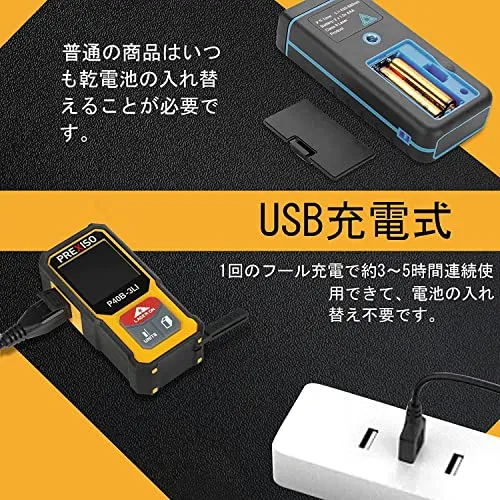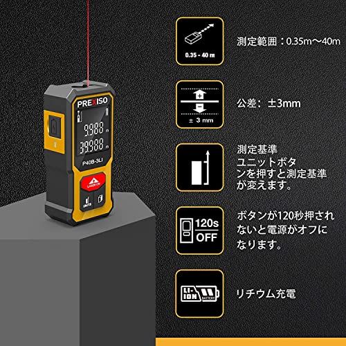 PREXISO レーザー距離計 電子距離計 距離測定計 ミニ 40M PSC認定取得 コンパクト 高精度 USB充電式 6種測定モード 距離 面積 体積 ピタゴラス測定 連続測定 自動計算 操作簡単 日曜大工 家庭 建設現場 土木現場の室内測定 イェローpo