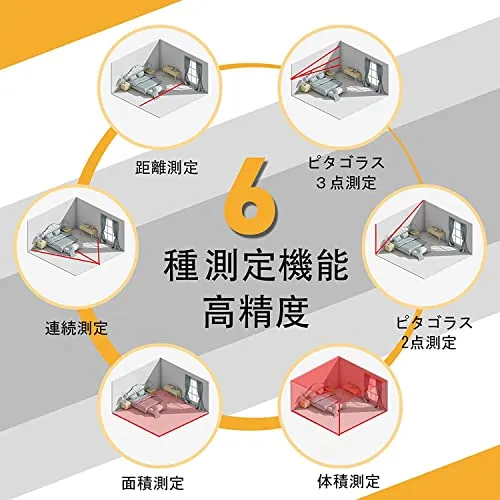 【6つの測定モード】距離測定、連続測定、面積測定、体積測定、ピタゴラス2点測定、ピタゴラス3点測定と6モードあります。測定基準位置は本機先端と後端と両方設定できて、暗がりでも見やすいバックライト付いているので、色んな使用シーンに対応します。