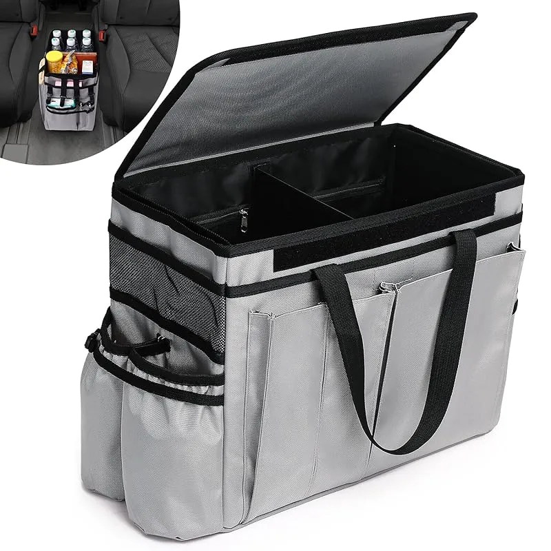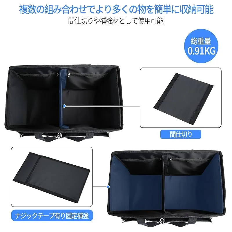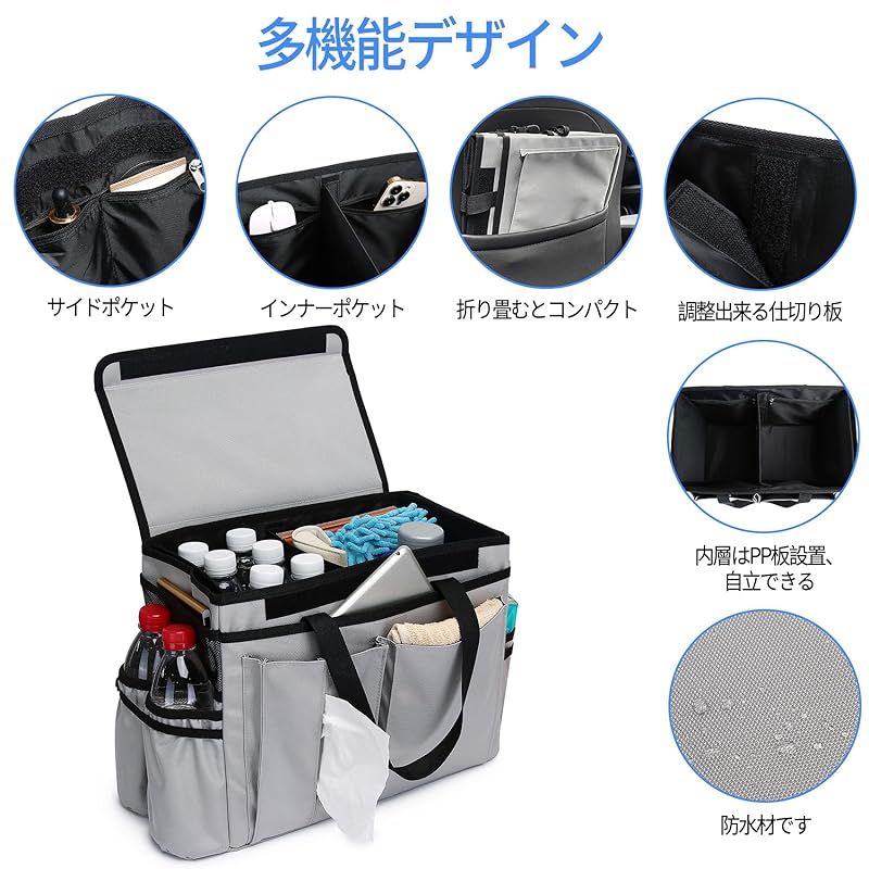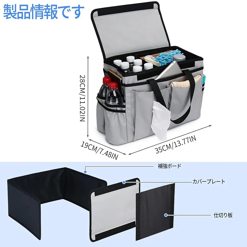 【商品概要】 ?『大容量収納で多機能』 小物が整理しやすい15個のポケット付き。仕切りを使えば、さらにスペースを有効活用できます。ペットボトル、ティッシュ、書類、筆記用具など、用途に合わせて整理ができ、必要なものをいつでも簡単に見つけることができます。 ?『滑り止め付きで運転中も安全』 収納ボックスの底には滑り止めがついており、走行中ボックスが転倒するのを防ぎます。ステップワゴン、シエンタ、ルーミー、セレナ、アルファード、フリード、ヴォクシー、など、ウォークスルータイプ車では、運転席と助手席の間に置いて、コンソールボックスとしても活躍できます。なお、滑り止めはマジックテープ式で、ボックスの場所移動も簡単です。 ?『折りたたみ式収納でコンパクト』 ボックスのサイドには、折りたたみ時の固定用フックが付いており、畳むとてもコンパクトになります。不使用時は、シートバックポケットに収納できるのでスペースを取りません。コンパクトサイズでいつでも手軽に持ち歩けます。 ?『持ち運び可能』 持ち手があるので、取り外しできるカバーを付ければ、荷物を収納したままの持ち歩きも安心です。車中泊用品の収納、トランクの収納など、車内便利グッズとしてご利用いただくほか、キャンプやバーベキューの道具やお弁当の持ち運び、マザーズバッグ、防災用具バッグとしても活用できます。 ?『防水加工でお手入れ簡単』 外側、内側ともに撥水に優れた材質を使用しており、水や汚れも簡単に拭き取ることができます。さっとひと拭きでお手入れ完了です。