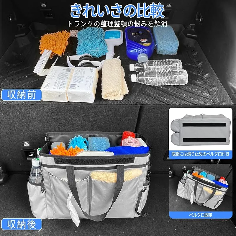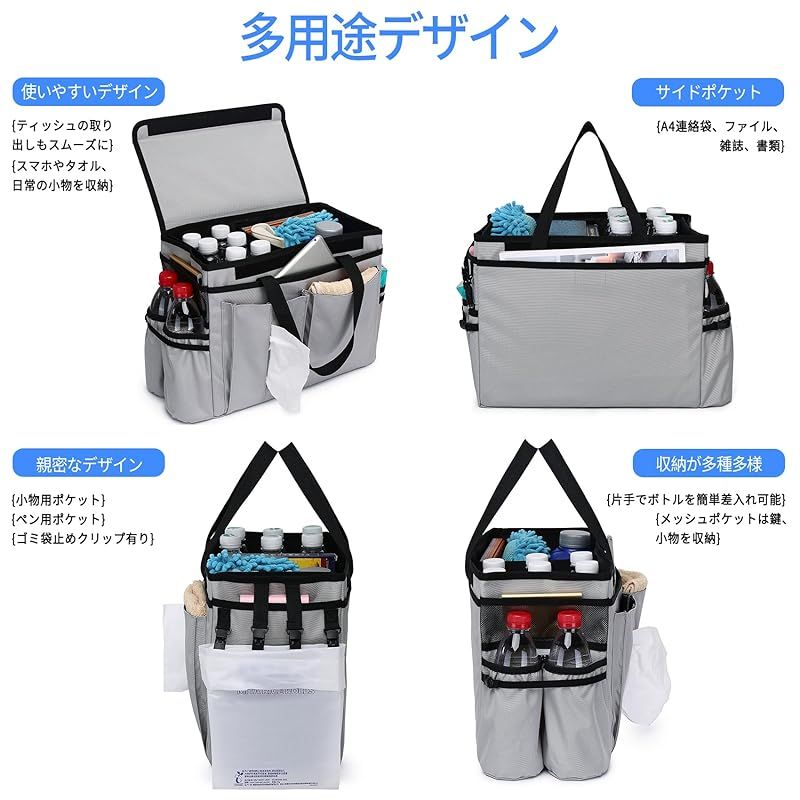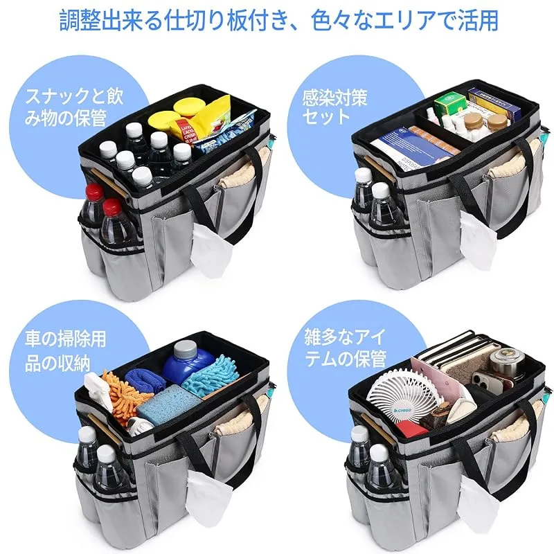 【商品概要】 ?『大容量収納で多機能』 小物が整理しやすい15個のポケット付き。仕切りを使えば、さらにスペースを有効活用できます。ペットボトル、ティッシュ、書類、筆記用具など、用途に合わせて整理ができ、必要なものをいつでも簡単に見つけることができます。 ?『滑り止め付きで運転中も安全』 収納ボックスの底には滑り止めがついており、走行中ボックスが転倒するのを防ぎます。ステップワゴン、シエンタ、ルーミー、セレナ、アルファード、フリード、ヴォクシー、など、ウォークスルータイプ車では、運転席と助手席の間に置いて、コンソールボックスとしても活躍できます。なお、滑り止めはマジックテープ式で、ボックスの場所移動も簡単です。 ?『折りたたみ式収納でコンパクト』 ボックスのサイドには、折りたたみ時の固定用フックが付いており、畳むとてもコンパクトになります。不使用時は、シートバックポケットに収納できるのでスペースを取りません。コンパクトサイズでいつでも手軽に持ち歩けます。 ?『持ち運び可能』 持ち手があるので、取り外しできるカバーを付ければ、荷物を収納したままの持ち歩きも安心です。車中泊用品の収納、トランクの収納など、車内便利グッズとしてご利用いただくほか、キャンプやバーベキューの道具やお弁当の持ち運び、マザーズバッグ、防災用具バッグとしても活用できます。 ?『防水加工でお手入れ簡単』 外側、内側ともに撥水に優れた材質を使用しており、水や汚れも簡単に拭き取ることができます。さっとひと拭きでお手入れ完了です。