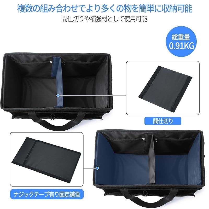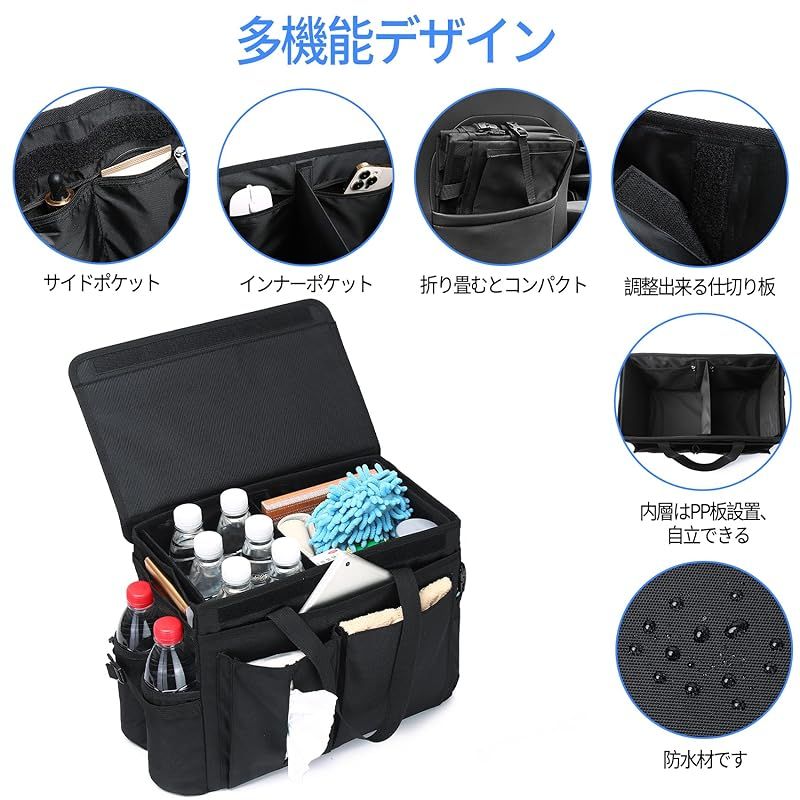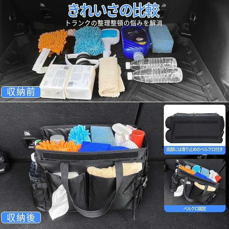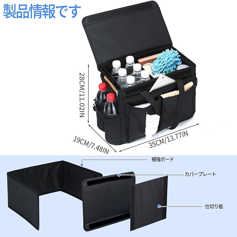 【商品概要】 ?『大容量収納で多機能』 小物が整理しやすい15個のポケット付き。仕切りを使えば、さらにスペースを有効活用できます。ペットボトル、ティッシュ、書類、筆記用具など、用途に合わせて整理ができ、必要なものをいつでも簡単に見つけることができます。 ?『滑り止め付きで運転中も安全』 収納ボックスの底には滑り止めがついており、走行中ボックスが転倒するのを防ぎます。ステップワゴン、シエンタ、ルーミー、セレナ、アルファード、フリード、ヴォクシー、など、ウォークスルータイプ車では、運転席と助手席の間に置いて、コンソールボックスとしても活躍できます。なお、滑り止めはマジックテープ式で、ボックスの場所移動も簡単です。 ?『折りたたみ式収納でコンパクト』 ボックスのサイドには、折りたたみ時の固定用フックが付いており、畳むとてもコンパクトになります。不使用時は、シートバックポケットに収納できるのでスペースを取りません。コンパクトサイズでいつでも手軽に持ち歩けます。 ?『持ち運び可能』 持ち手があるので、取り外しできるカバーを付ければ、荷物を収納したままの持ち歩きも安心です。車中泊用品の収納、トランクの収納など、車内便利グッズとしてご利用いただくほか、キャンプやバーベキューの道具やお弁当の持ち運び、マザーズバッグ、防災用具バッグとしても活用できます。 ?『防水加工でお手入れ簡単』 外側、内側ともに撥水に優れた材質を使用しており、水や汚れも簡単に拭き取ることができます。さっとひと拭きでお手入れ完了です。