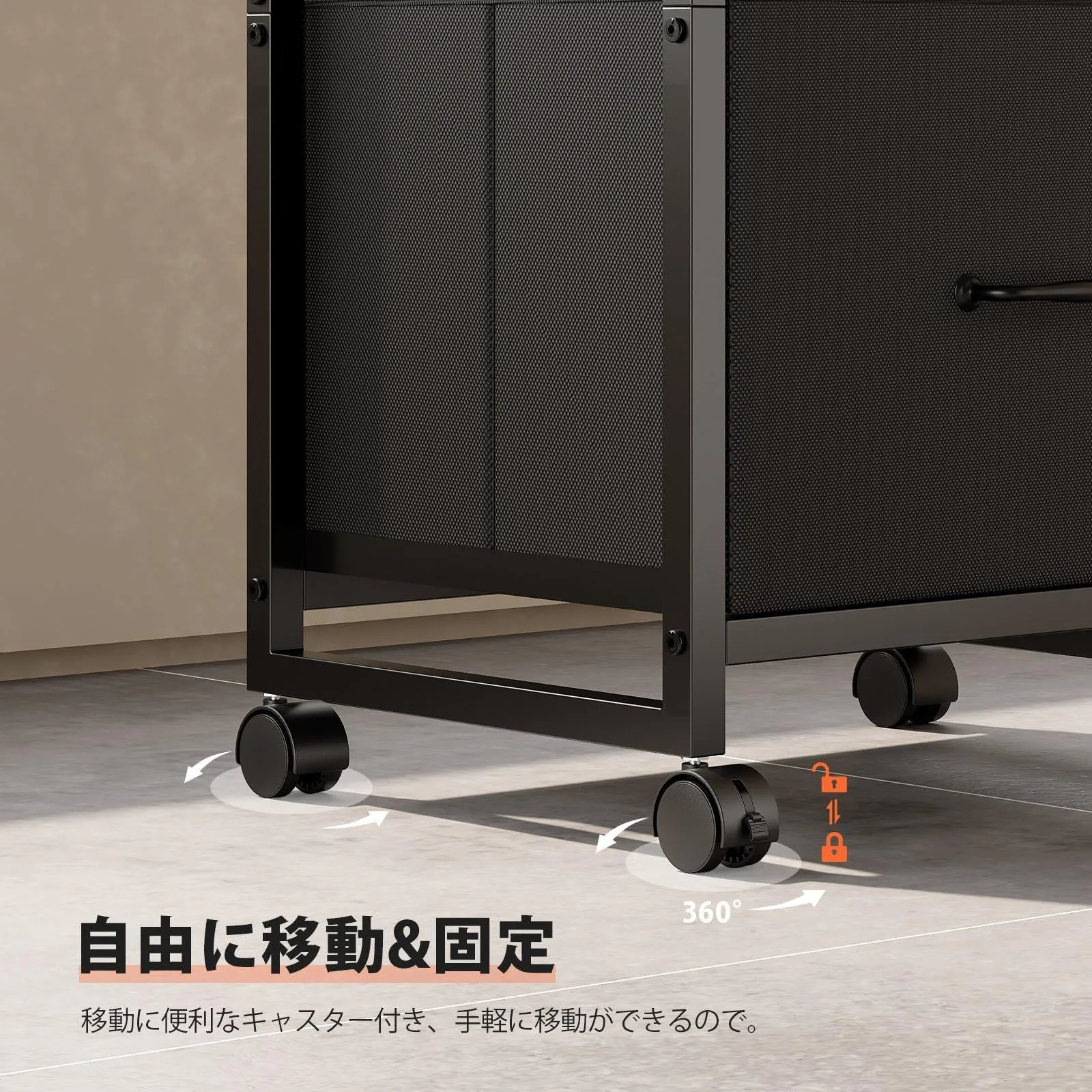 【移動便利】引き出しの取材がオックスフォード布と不織布なので、サイドワゴン全体がとても軽く、移働に便利なキャスターがついています。手軽に移動ができますので、レイアウトの変更や掃除の際も簡単に移動ができます。また、ストッパーが付いているので、引出しを開ける度にワゴンが一緒に動いてしまったり、転倒したりすることはありません。