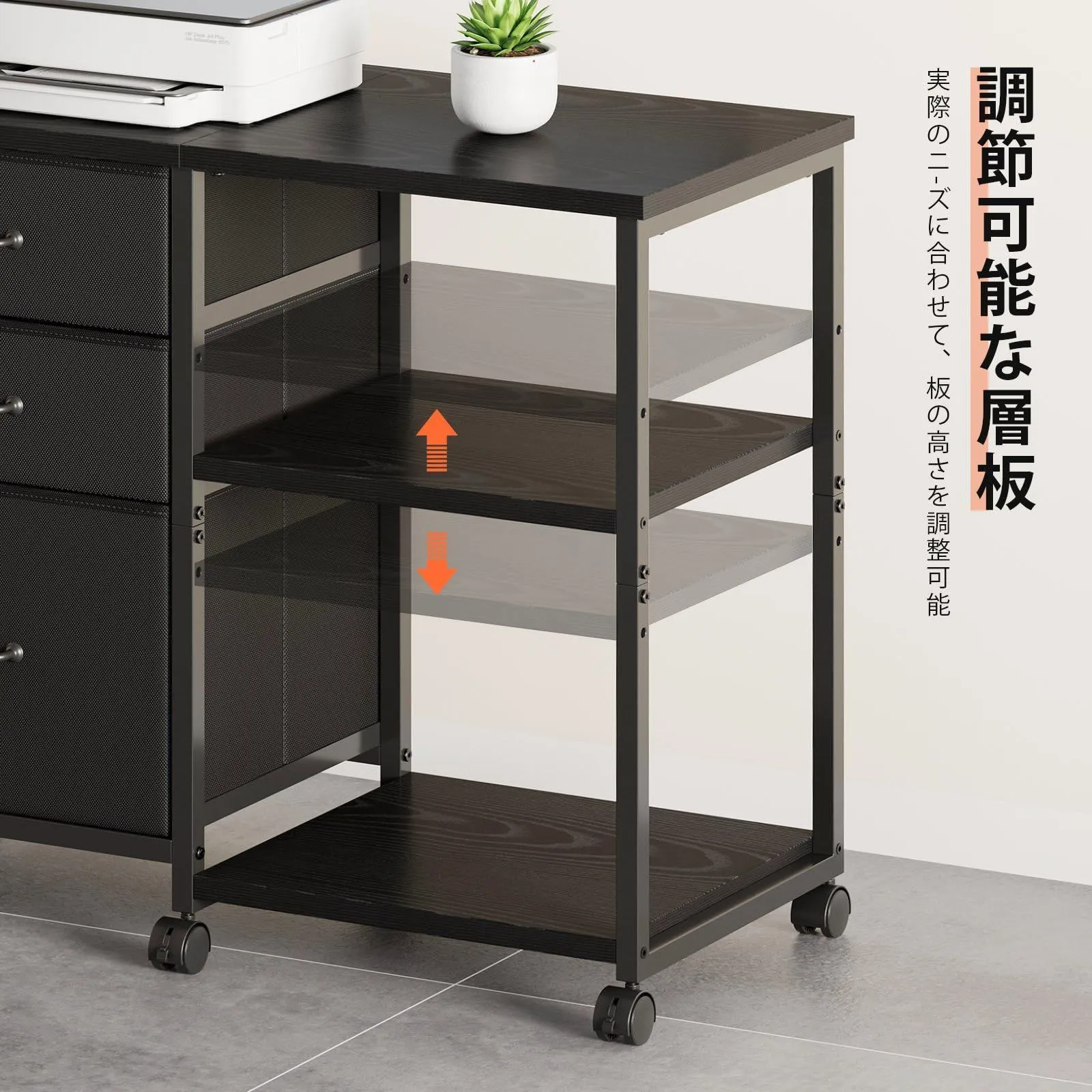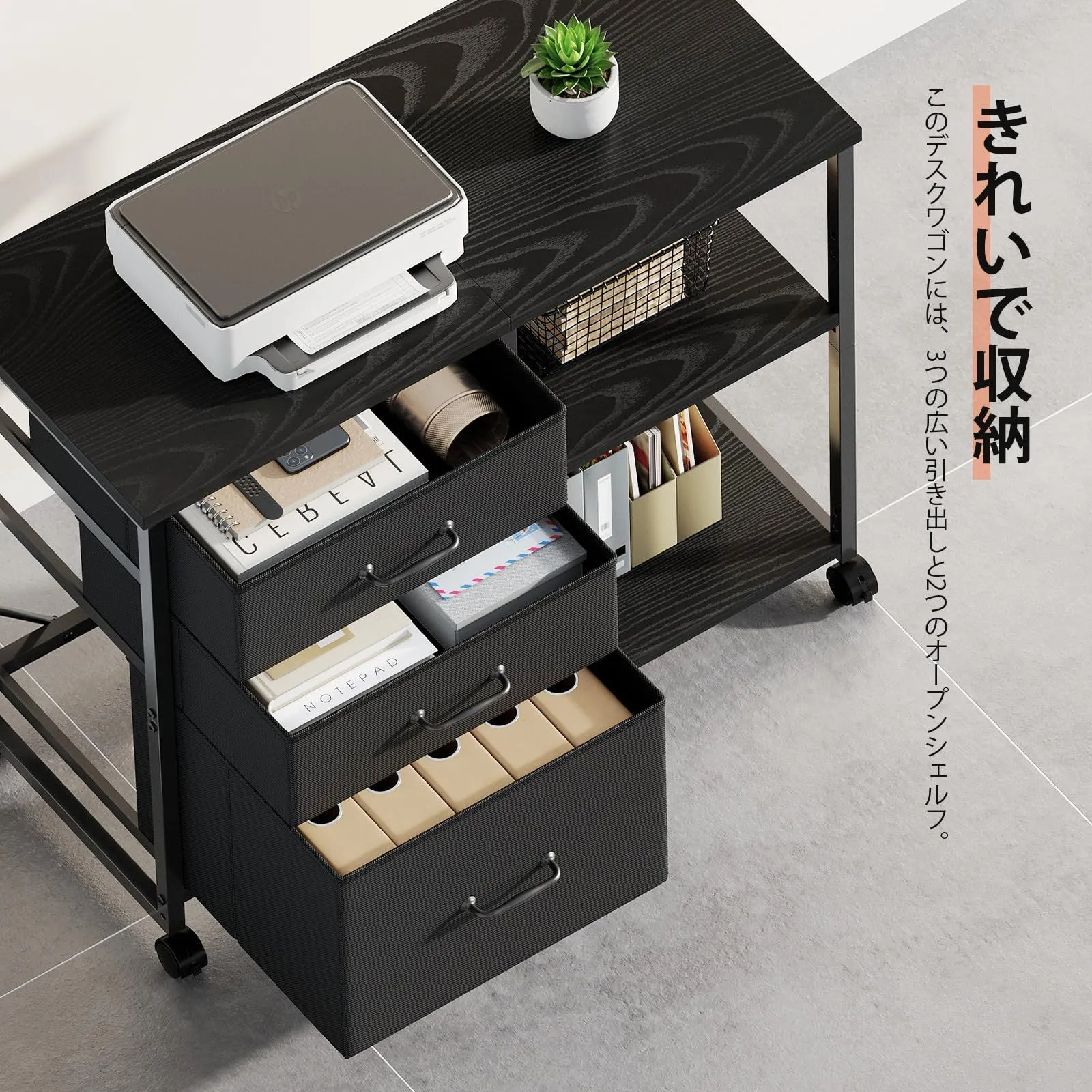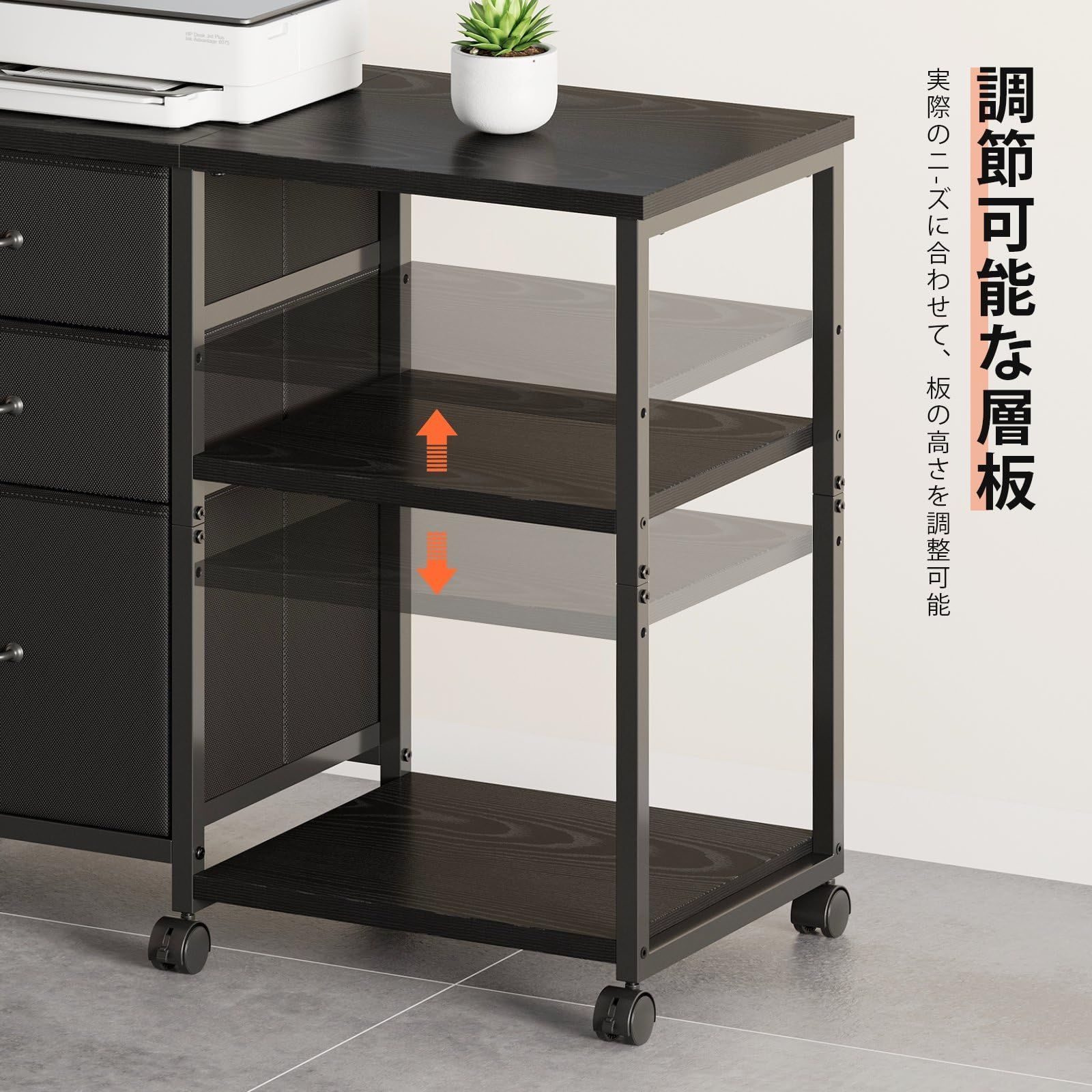 【訳アリ】サイドキャビネット デスクワゴン 布製 袖机 層板付き サイドワゴン 3段 オフィスワゴン A4対応 プリンター台 大容量 キャスター付き デスク下収納 黒