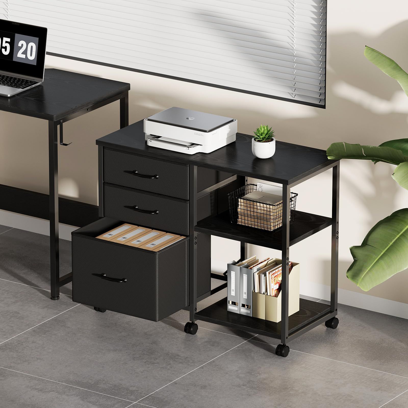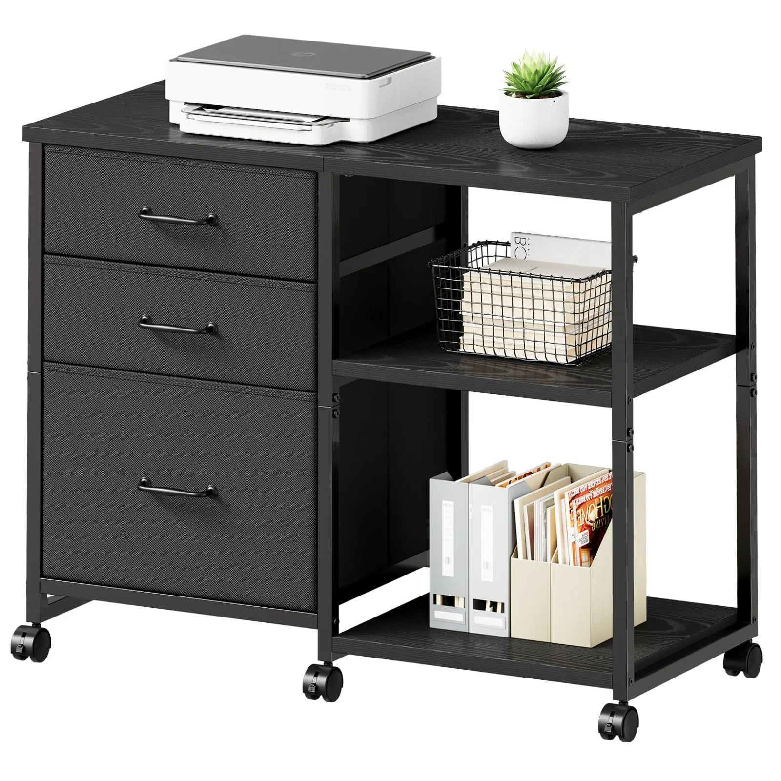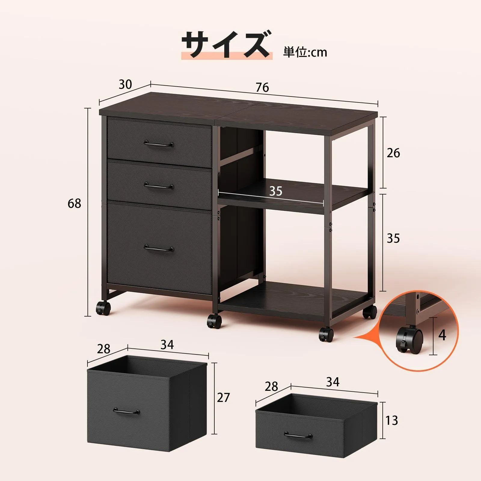 【訳アリ】サイドキャビネット デスクワゴン 布製 袖机 層板付き サイドワゴン 3段 オフィスワゴン A4対応 プリンター台 大容量 キャスター付き デスク下収納 黒