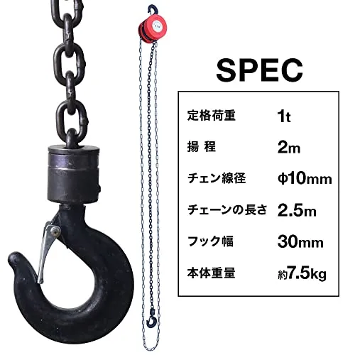 【商品詳細】定格荷重:1t、吊上荷重:0.5t前後、牽引荷重:1t前後、揚程:2m、チェン線径:チェーン1本あたり5mm、2本あわせて10mm、チェーン長さ(全体の長さ):約2.5m、フック幅:30mm、本体重量:約7.5kg