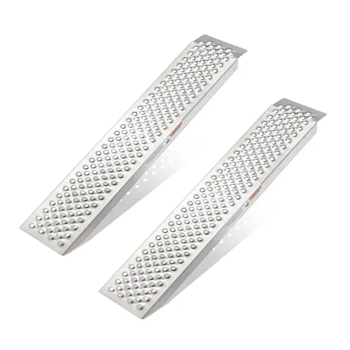 【商品仕様】アルミブリッジのサイズ:長さ120*幅21.5*高さ3.5cm(単本)、製品の重さ:約5.75kg(2本)、耐荷重:680kg(2本)、使用高さ範囲:40cm以下、タイヤの幅が21cm以内の車両に適しています。