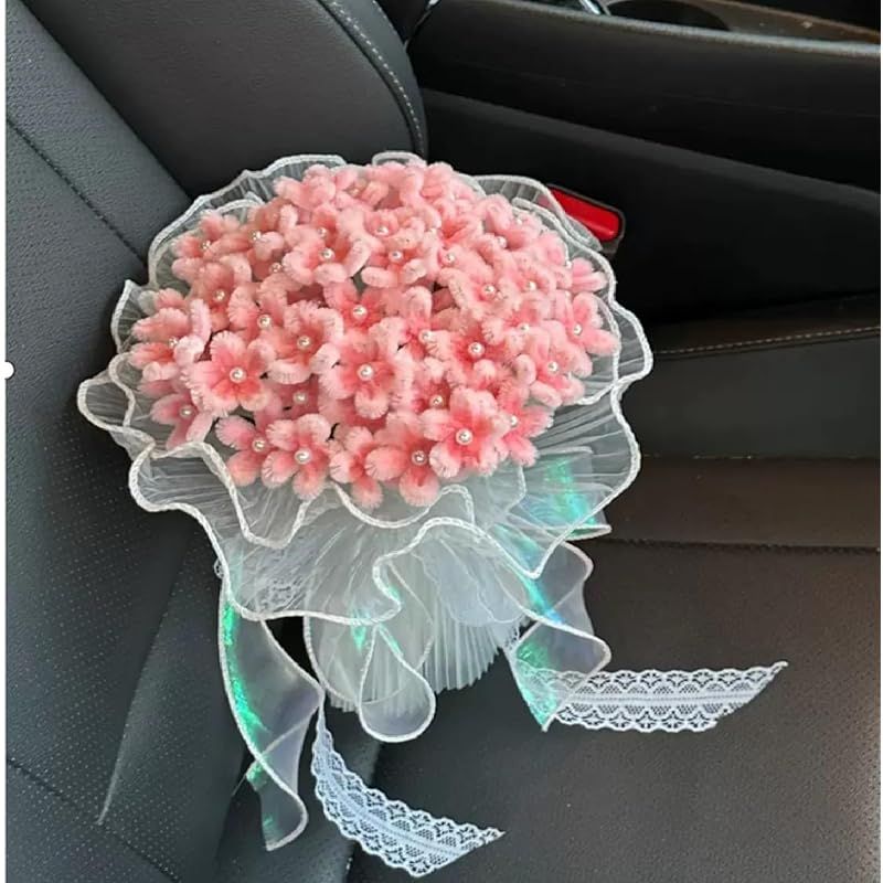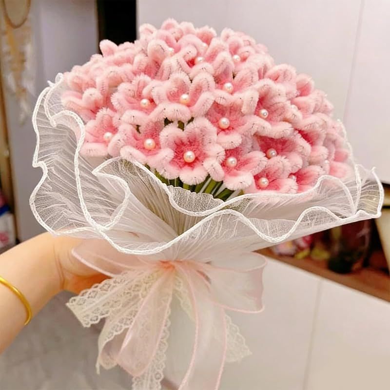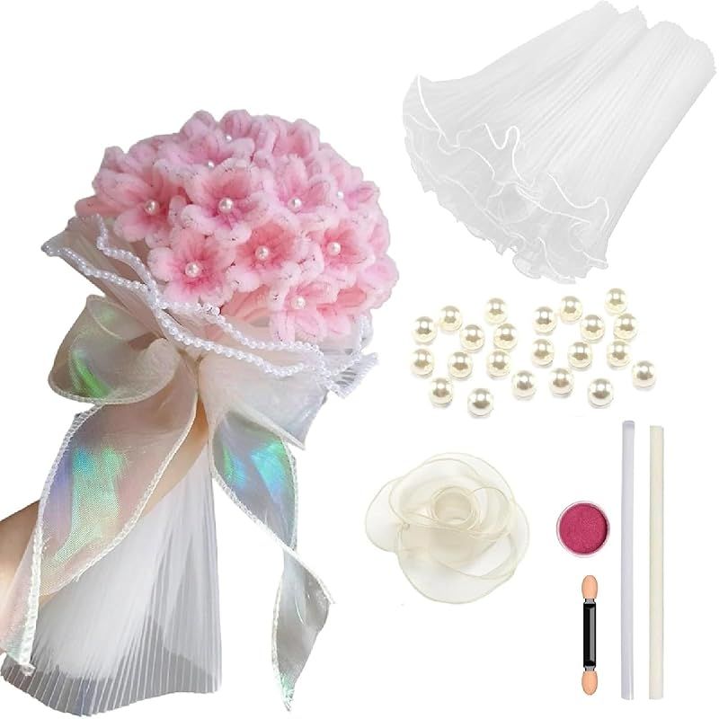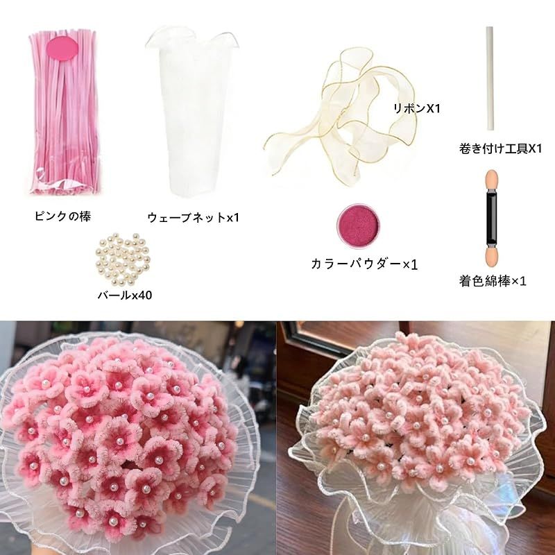 【ハンドメイドブーケセット】手芸モール100本、パール、リボン、カラーパウダーがセットになっています。このセット1つで50個の美しい花を作ることができ、すぐに手作りのフラワーアート作りを始めることができます。