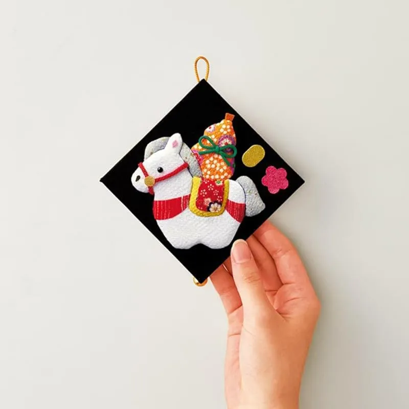 【商品概要】 サイズ:縦48×横14.3cm 製作時間:1時間~(1個あたり) 必要なもの:はさみ・セロテープ・ボンド(木工用・手芸用)・専用目打ち 材質:布・ウレタン・厚紙 セット内容:説明書(実物大図付き)・パーツ早見表・ウレタン付きボール紙(型抜済)・布・土台用(布・厚紙・鈴・紐)・小物