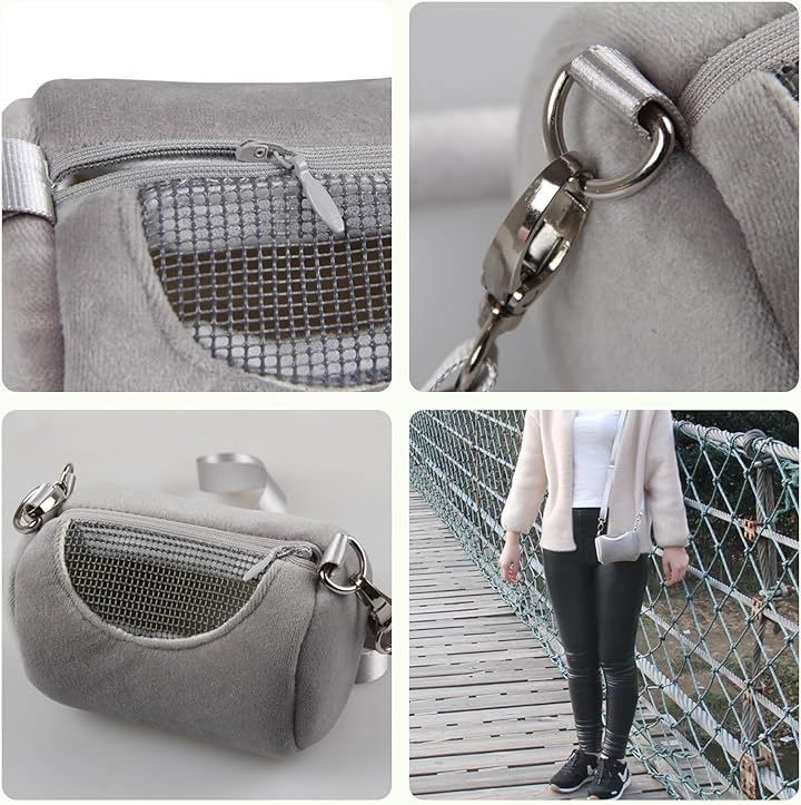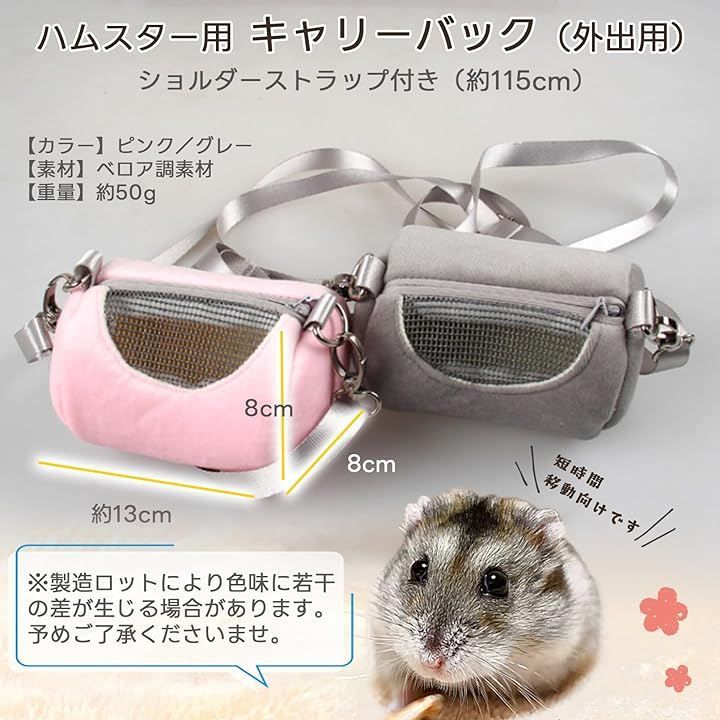 「商品内容」ハムスター用 キャリーバッグ(外出用)「カラー」ピンク/グレー「サイズ」約13x8x8cm「素材」ベロア調素材「内容」ショルダーストラップ付き(約115cm)/重量:約50g *製造ロットにより色味に若干の差が生じる場合があります。
