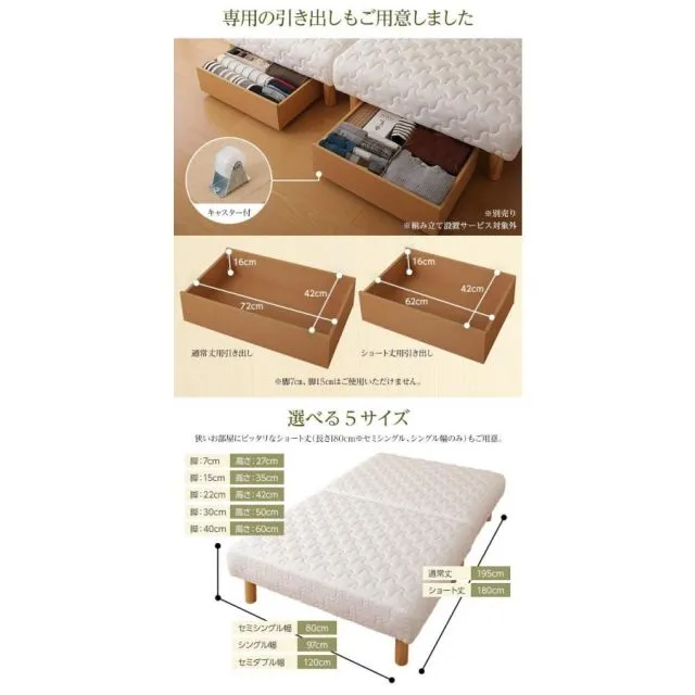 商品名:脚付きマットレス 国産 分割型 ポケットコイル 通常丈 セミシングル 脚40cm 組立設置サービス付き