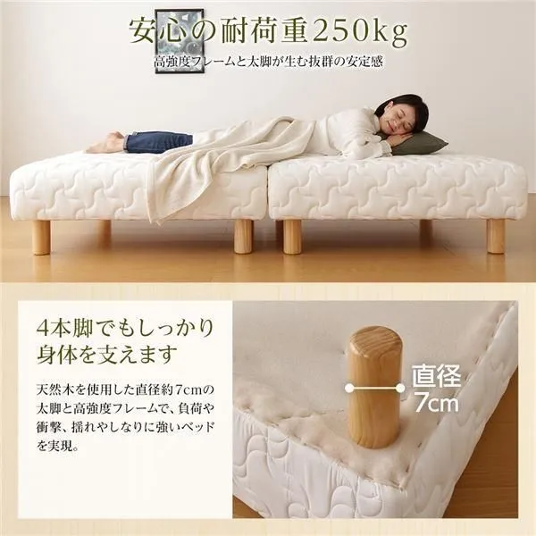 【安心の耐荷重250kg】 高強度フレームと太脚が抜群の安定感 8本脚でしっかり身体を支えます。 天然木を使用した直径約7cmの太脚と高強度フレームで、 負荷や衝撃、揺れやしなりに強いベッドを実現。