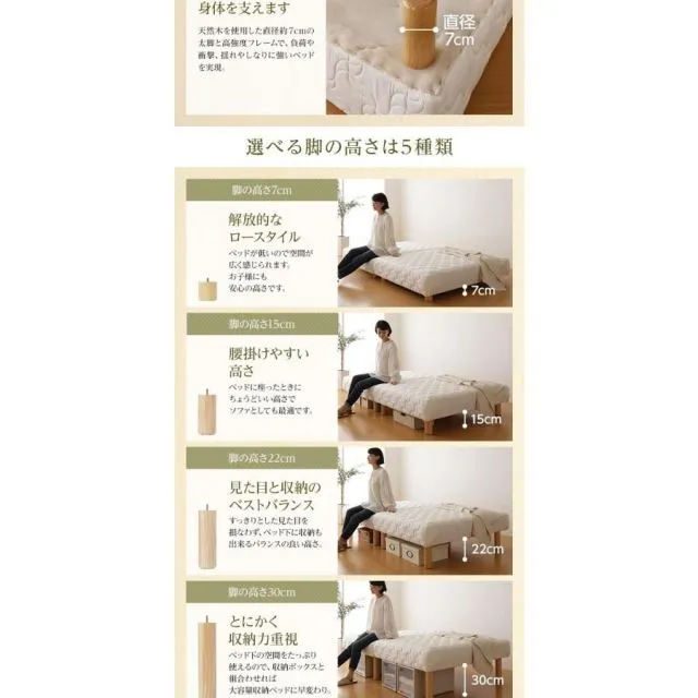 【選べる脚の高さは5種類】 脚の高さは7cm 開放的なロースタイル ベッドが低いので空間が広く感じられます。 お子様にも安心の高さです。 脚の高さは15cm 腰掛けやすい高さ ベッドに座ったときにちょうどいい高さで ソファとしても最適です。 脚の高さ22cm 見た目と収納のベストバランス すっきりとした見た目を損なわず、 ベッド下に収納もできるバランスの良い高さ。 脚の高さ30cm とにかく収納力重視 ベッド下の空間をたっぷり使えるので、 収納ボックスと組み合わせれば大容量収納ベッドに早変わり。 脚の高さ40cm マットレスベッドの最高峰 ベッド下の広大な空間はまるでクローゼット! 幅広い収納物をストレスなくしまうことができます。 ※各脚は別売オプション販売しております。 後から異なる高さの脚も追加で購入できます。