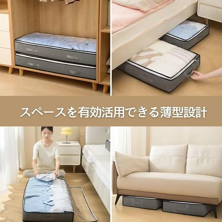 「スペースを有効活用できる薄型設計」お部屋の隙間やベッド下にぴったり収まる薄型タイプの衣類収納袋。
