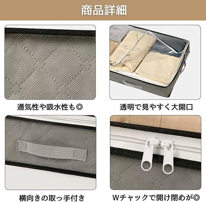 「商品詳細」サイズ:約100x50x15cm 容量:約75L カラー:ブラック/グレー 素材:通気性の良い不織布+透明PVC窓 セット内容:2枚セット 仕様:持ち手付き、折りたたみ可、軽量設計