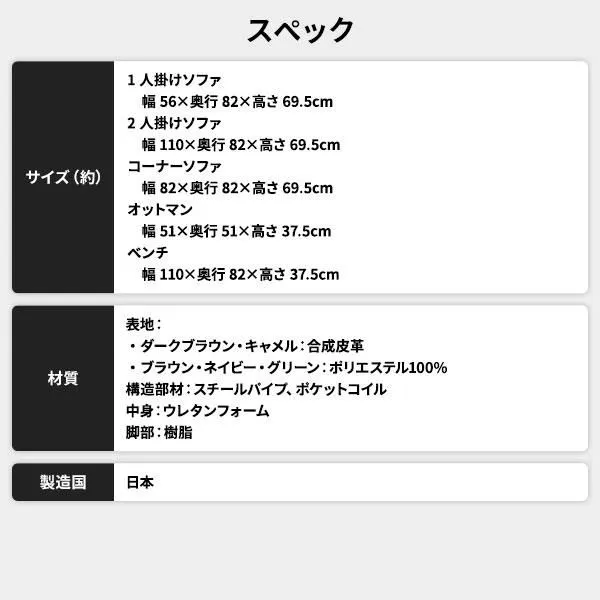 【サイズ(約)】 1人掛けソファ 幅56×奥行82×高さ69.5cm 2人掛けソファ 幅110×奥行82×高さ69.5cm コーナーソファ 幅82×奥行82×高さ69.5cm オットマン 幅51×奥行51×高さ37.5cm ベンチ 幅110×奥行51×高さ37.5cm