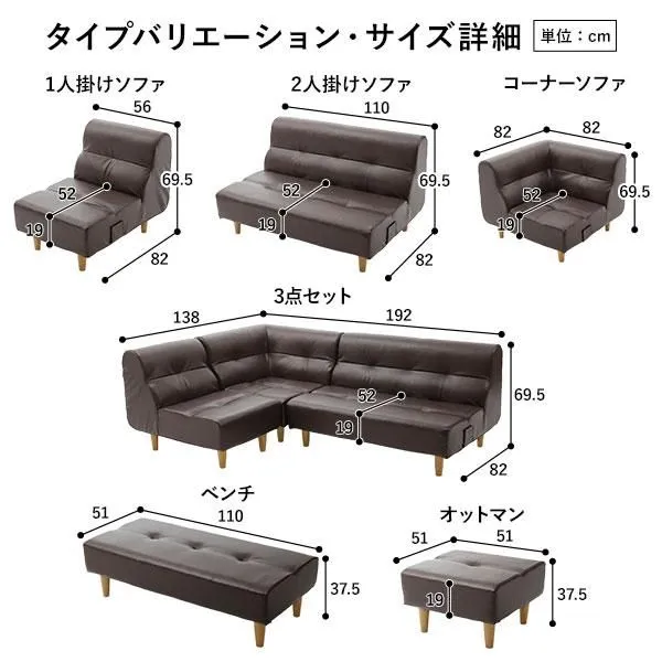【タイプバリエーション】 間取りやスペースに合わせて組み合わせ自在。 ・1人掛けソファ ・2人掛けソファ ・コーナーソファ ・3点セット(1人掛け・2人掛け・コーナー) ・オットマン ・ベンチ