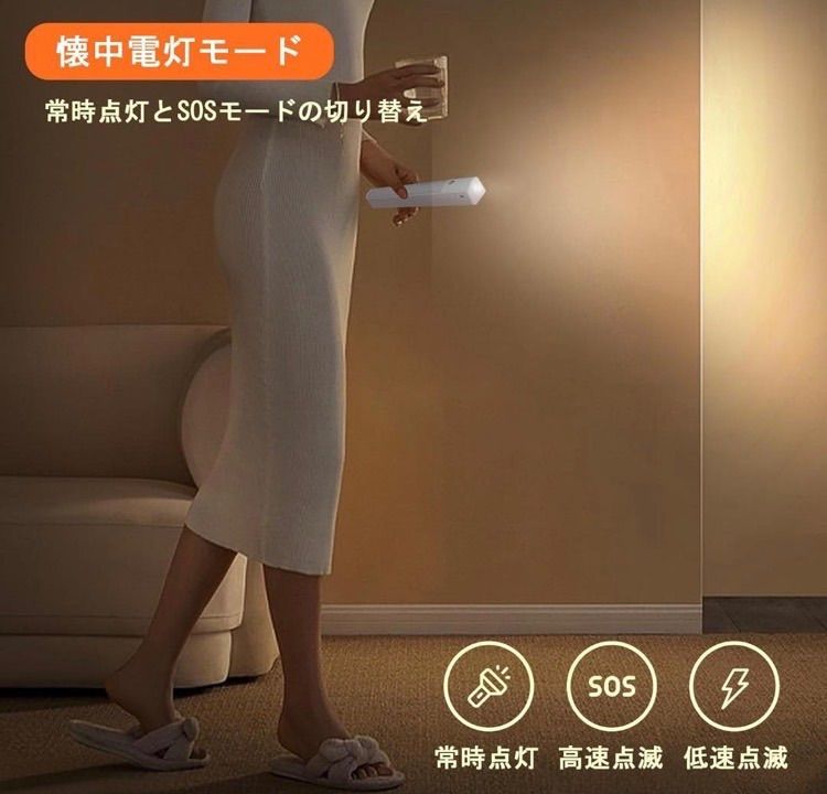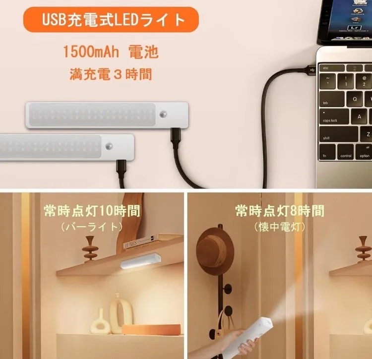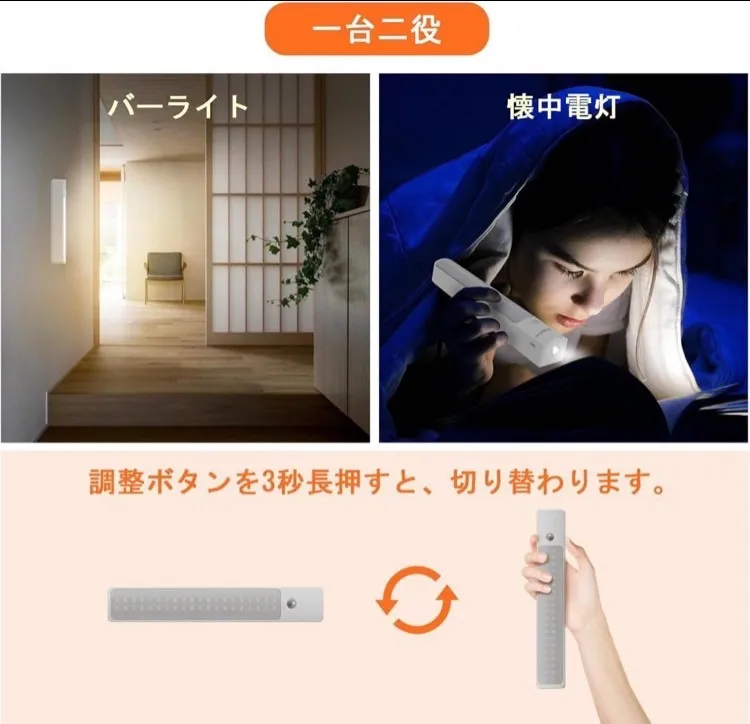 【一台二役の便利な機能】バーライトと懐中電灯の2つのモードがあります。調整ボタンを3秒間長押しするだけで、簡単にモードを切り替えることができます。バーライトモードは、寝室、リビングルーム、キッチンなどの室内照明に最適です。人感センサーが搭載されているため、人の動きを感知し自動的に点灯します。また、懐中電灯モードは、アウトドア活動や緊急時に活躍します。