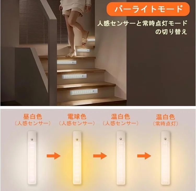 【バーライトモード】バーライトモードでは人感センサーと常時点灯モードが切り替え可能です。調整ボタンを短く押すだけで、次の順序でライトモードと色温度を切り替えることができます:昼白色(人感センサー)→ 電球色(人感センサー)→ 温白色(人感センサー)→ 温白色(常時点灯)。これにより、ご自宅の雰囲気や状況に応じて適切な照明を提供します。