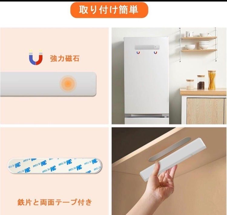 【取り付け簡単】取り付け方法は2つあります。強力な磁石を使用して金属表面に取り付けることができます。また、パッケージに付属の鉄片と両面テープを使って非金属表面にも取り付けることが可能です。これにより、このセンサーライトは設置場所を選ばずに使用することができます。