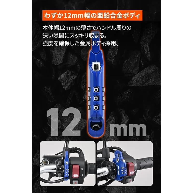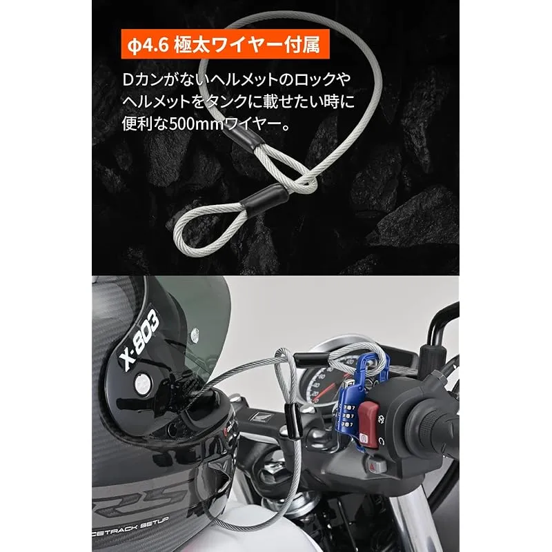 【特許出願中】 本体幅12mmとスリムでハンドル周りの狭い隙間にスッキリ収まる ロック部は縦方向に大きくスライド。左右のスペースが無くてもDリングやワイヤーを掛けやすい カギ持ち運びが不要なダイヤルタイプ。ロック中は取付ネジにアクセスできない仕様で防犯性アップ φ4.6極太の500mmワイヤー付属。Dリングのないヘルメットロックやヘルメットをタンクに載せたい時に便利