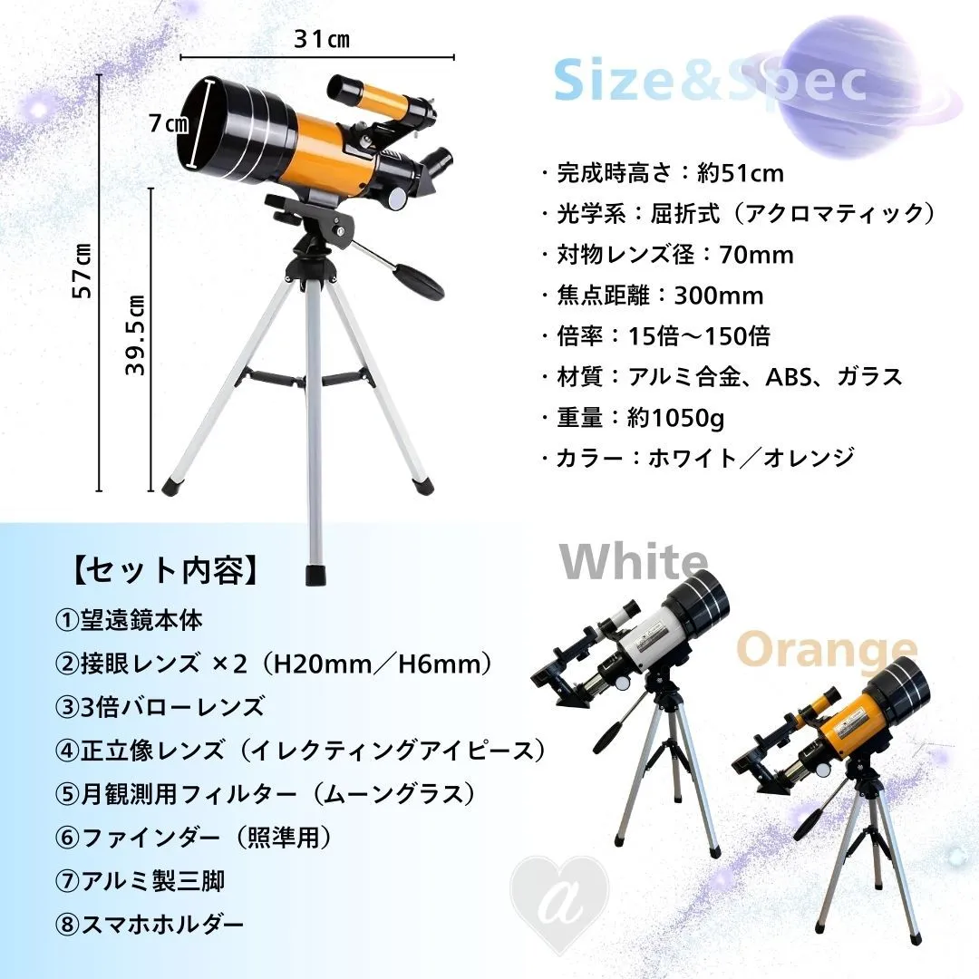 【製品仕様】 完成時:高さ約51cm~57cm 光学系:屈折式(アクロマティック) 対物レンズ径:70mm 焦点距離:300mm 接眼レンズ:H20mm / H6mm 倍率:15倍~150倍 材質:アルミ合金、ABS、ガラス 三脚:アルミ製(伸縮式) カラー:ホワイト/オレンジ 本体重量:約1050g