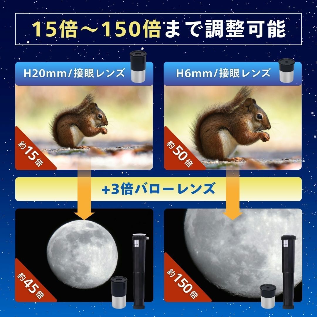 【セット内容】 ・望遠鏡本体 ・接眼レンズ ×2(H20mm/H6mm) ・3倍バローレンズ ・正立像レンズ(イレクティングアイピース) ・月観測用フィルター(ムーングラス) ・ファインダー(照準用) ・アルミ製三脚 ・スマホホルダー