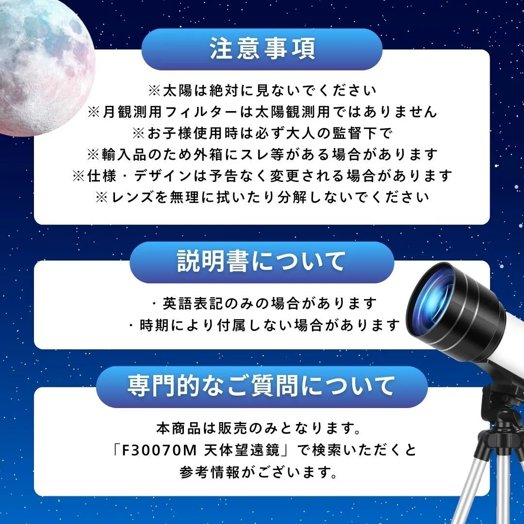 【専門的なご質問について】 ※本商品は販売のみを行っております。 ※天体観測の詳細な方法、専門的な設定、観測対象の選び方などの高度なご質問にはお答えできません。「F30070M 天体望遠鏡」で検索していただくと、インターネット上に使用方法や解説記事が多数ございますので、そちらをご参考ください。