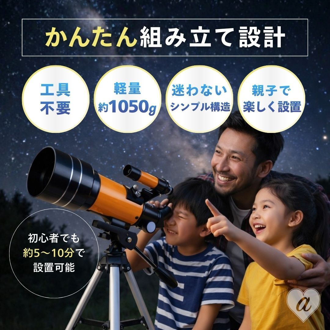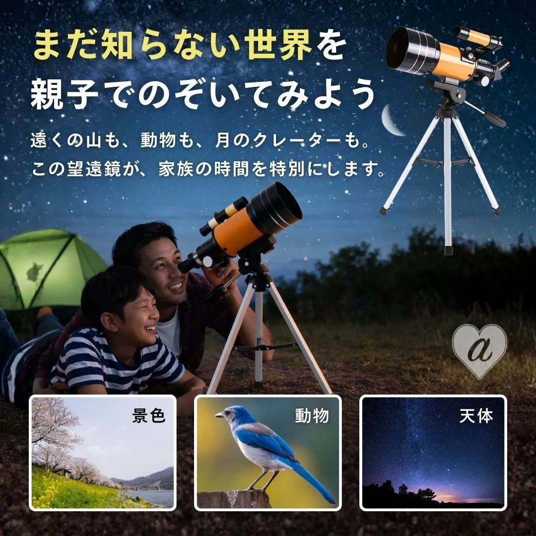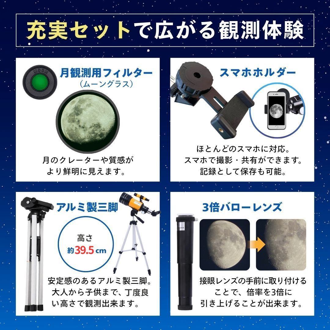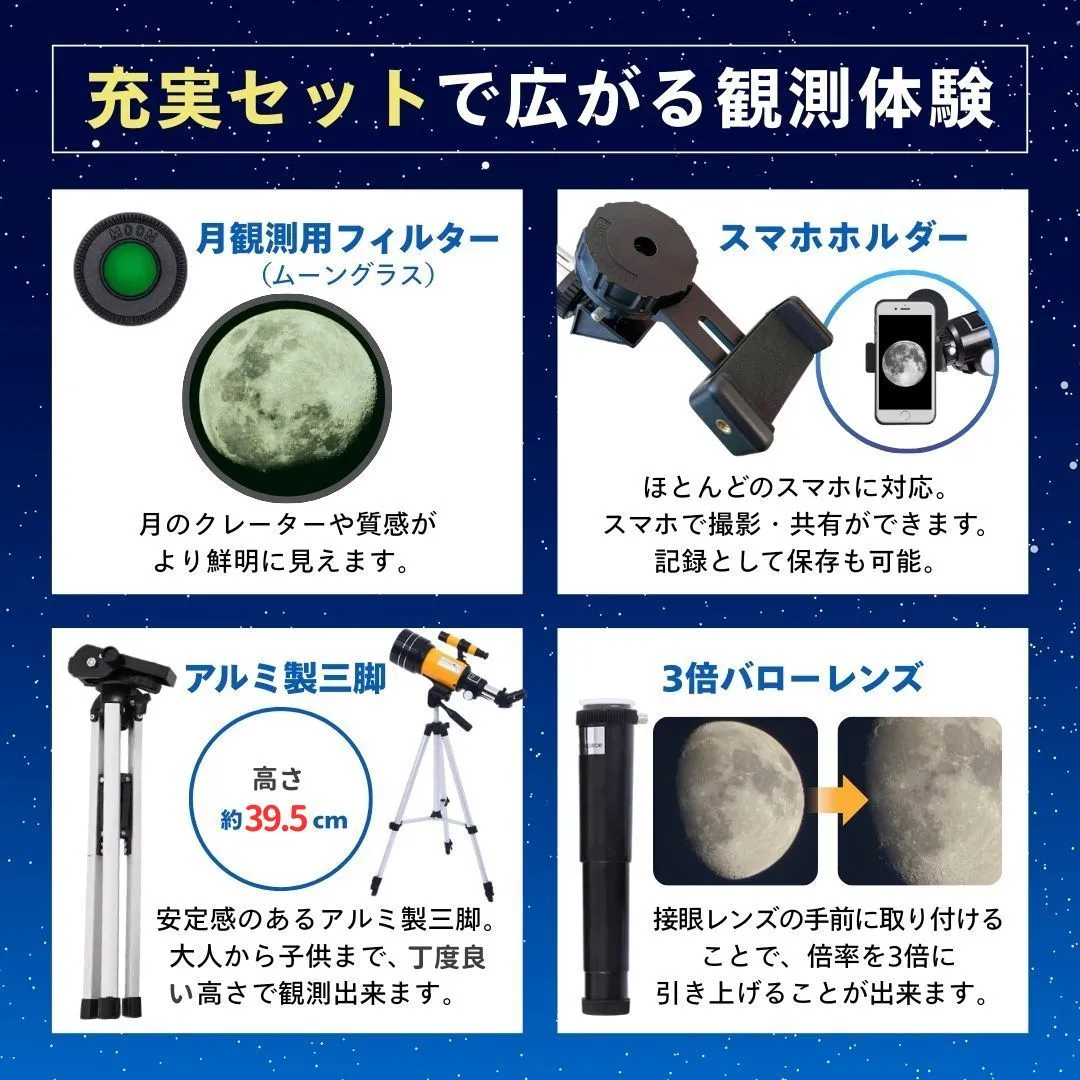 【主な特徴】 ・70mm大口径レンズ ・多くの光を取り込み、月面のクレーターなどを明るく観測可能 ・倍率15倍~150倍対応 ・接眼レンズ+3倍バローレンズの組み合わせで幅広い倍率に対応 ・天体・地上の両用設計 ・正立像レンズ(イメージエレクター)により地上観察も可能 ・スマホ撮影対応 ・スマホホルダー付属(一部セット)で観測した景色を撮影・保存 ・安定したアルミ製三脚 ・工具不要、初めてでも扱いやすい設計