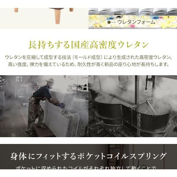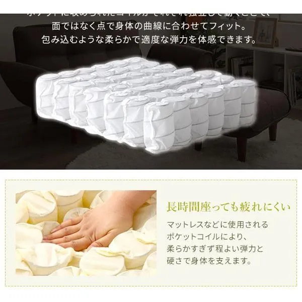 ■身体にフィットするポケットコイルスプリング ポケットに収められたコイルがそれぞれ独立して動くことで 面ではなく点で身体の曲線に合わせてフィット。 包み込むような柔らかで適度な弾力を体感できます。 ・長時間座っても疲れにくい マットレスなどに使用されるポケットコイルにより、柔らかすぎず程よい弾力と硬さで身体を支えます。