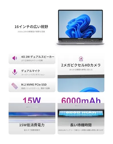 クリアな画面: 大型の 16 インチ IPS LCD ディスプレイは、1920 x 1200 のフル HD 解像度を特長としており、広々としたクリアな視覚体験を提供します。