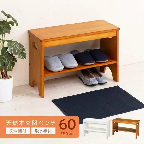 ■商品内容 腰をかけてラクに靴が履ける、玄関ベンチ 天然木の温かみのある玄関ベンチ。 靴を履く時や少し休憩されたい時におすすめ。 安心して作業が出来て、大変便利です。 カラーはどんな玄関にも合わせやすいブラウン、 清潔感のあるホワイトの2カラーです。 用途によって選べる3サイズ展開。(ホワイトは60サイズのみです) 棚にはスリッパや小物の置き場所に、 また棚下は普段使いの靴の収納に便利です。 移動に便利な持ち手穴付き。 =ご注意= 天然木の性質上、木目の柄や節、色味などに個体差がございます。 ご理解の上ご注文いただきますようお願いいたします。 ・天然木仕様 ・取っ手付 ・収納棚付 ・組立商品