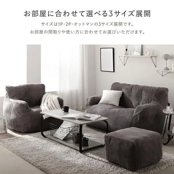 ■お部屋に合わせて選べる3サイズ展開 サイズは1P・2P・オットマンの3サイズ展開です。 お部屋の間取りや使い方に合わせてお選びいただけます。