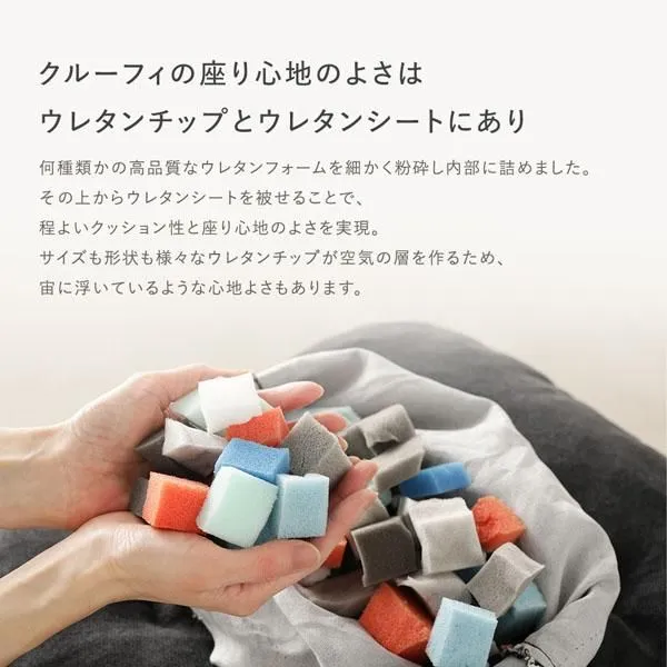 ■クルーフィの座り心地のよさはウレタンチップとウレタンシートにあり 何種類かの高品質なウレタンフォームを細かく粉砕し内部に詰めました。 その上からウレタンシートを被せることで、程よいクッション性と座り心地のよさを実現。 サイズも形状も様々なウレタンチップが空気の層を作るため、宙に浮いているような心地よさもあります。