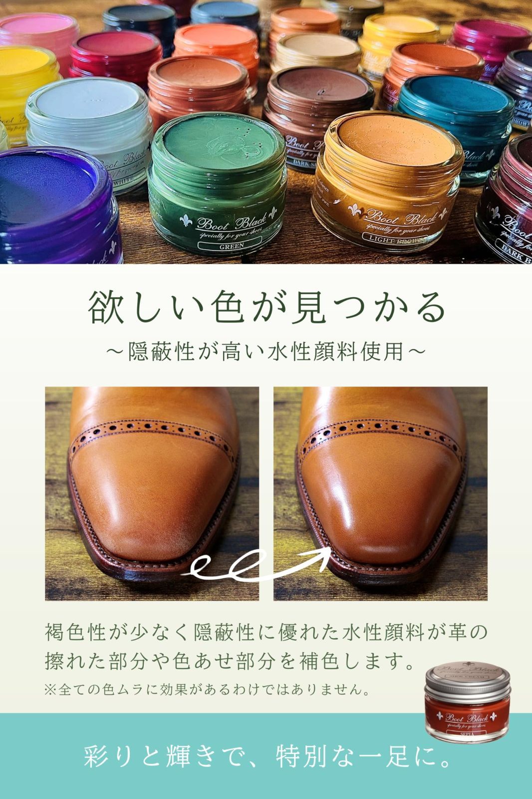 靴磨きの<プロ>が創り上げた靴クリーム。クリームの伸び、拭き取りの軽さ(布の走り)などの使いやすさと、皮革への優しさを追求した基礎シューケア用品です。90年以上の歴史が育んだワックスブレンド技術を活かした処方による光沢、保革はもちろん、磨き感に優れたシュークリームです。微結晶で特有の粘りのあるミツロウと、硬く高光沢の鉱物系ワックスが皮革表面に密着した滑らかなツヤを与えます。また、皮革内部にゆっくりと浸透するミネラルオイルを配合しましたので、優れた保革効果を与えます。55g入り